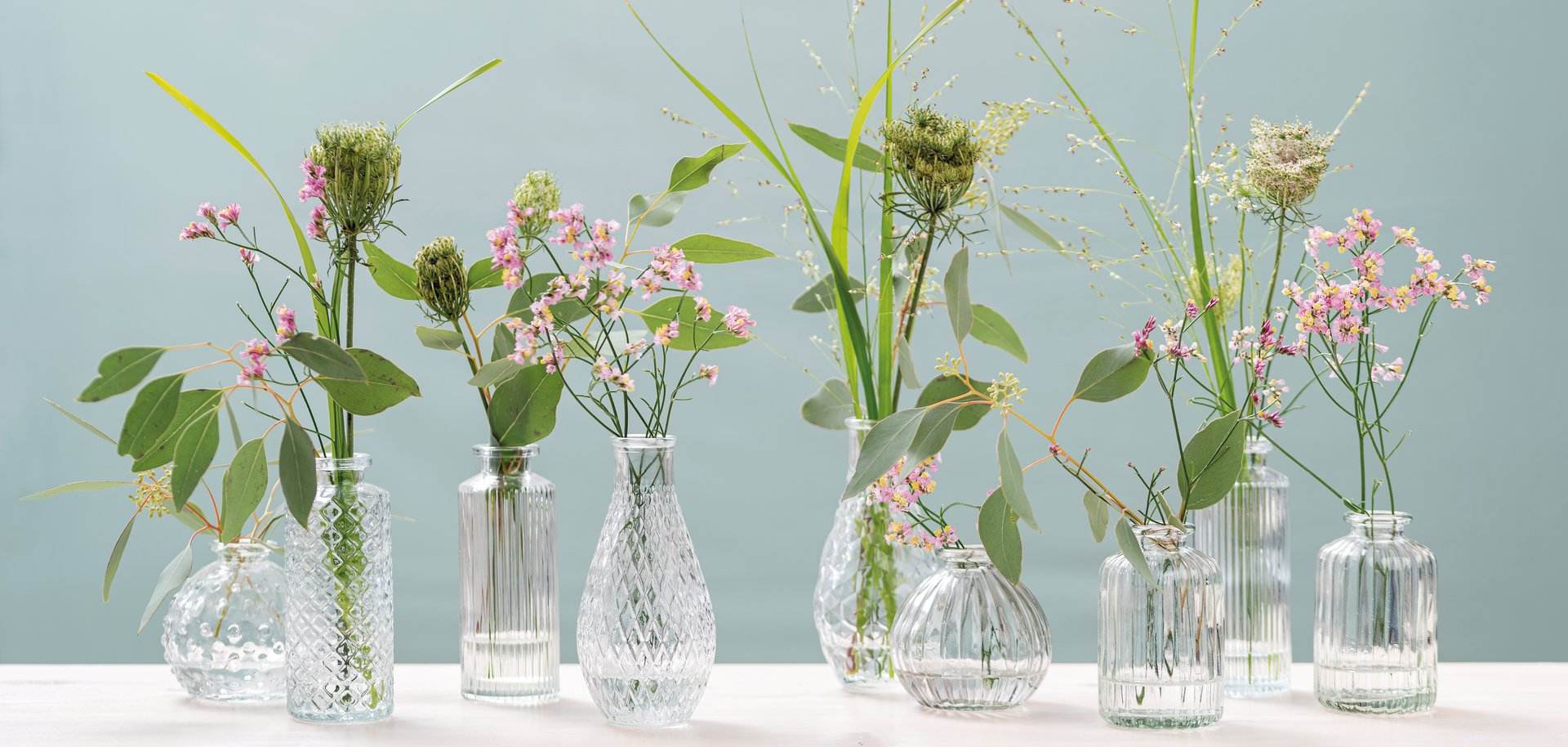Bouteille en verre bombée avec motif en losange et nid d'abeille. Assortiment de 2. Ouverture : Ø 2,5 cm.