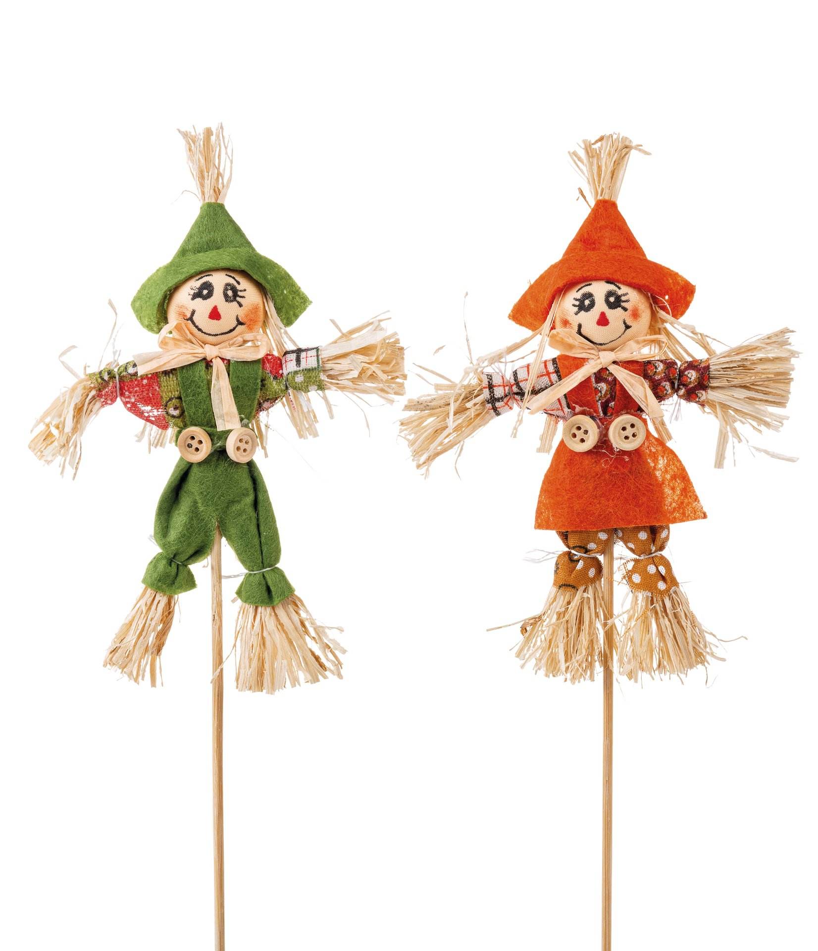 Epouvantail sur fiche en tissu de lin, raphia et feutre. 2 couleurs assorties.
