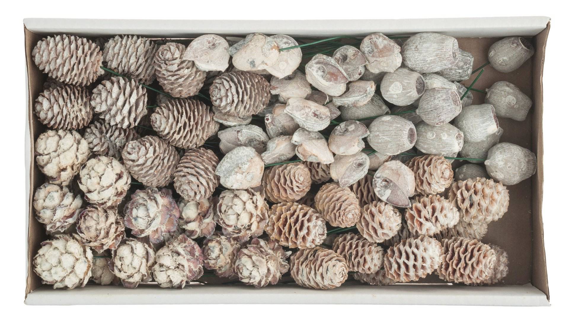 Mélange de cônes de leucadendron sur pique livrés dans une boîte pratique. Dimensions : env. Ø 3-4 cm, pique env. 9 cm.