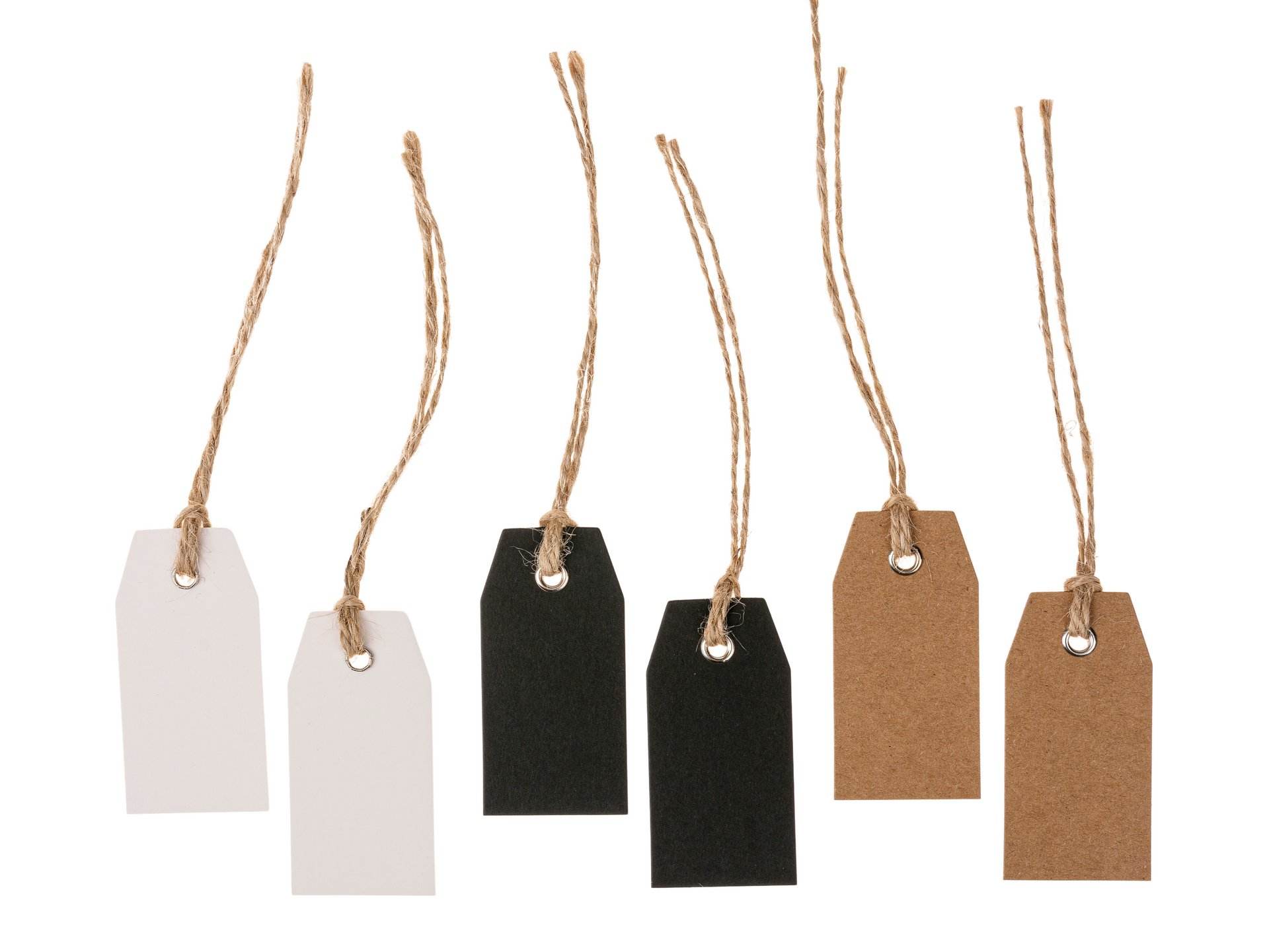 Étiquettes en carton pratiques, dotées d'un cordon de 13 cm de long. Avec oeillet pour empêcher que l'étiquette ne se déchire.