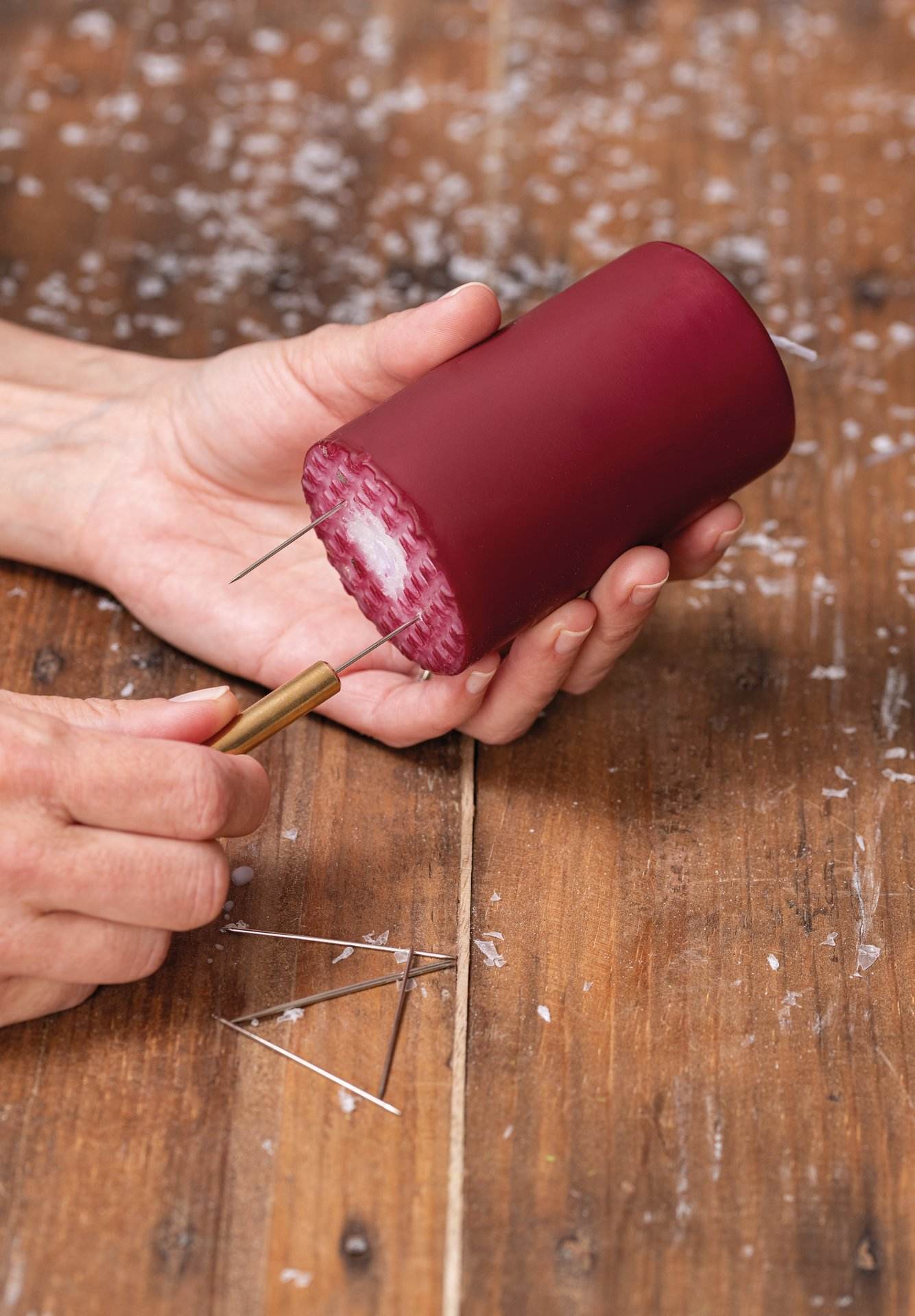 Des tiges métalliques solides pour fixer les bougies en toute sécurité, comme alternative au fil de fer traditionnel. Un poussoir adapté facilite l'enfoncement des chevilles dans la cire des bougies. 100 goupilles par boîte, pilote inclus.