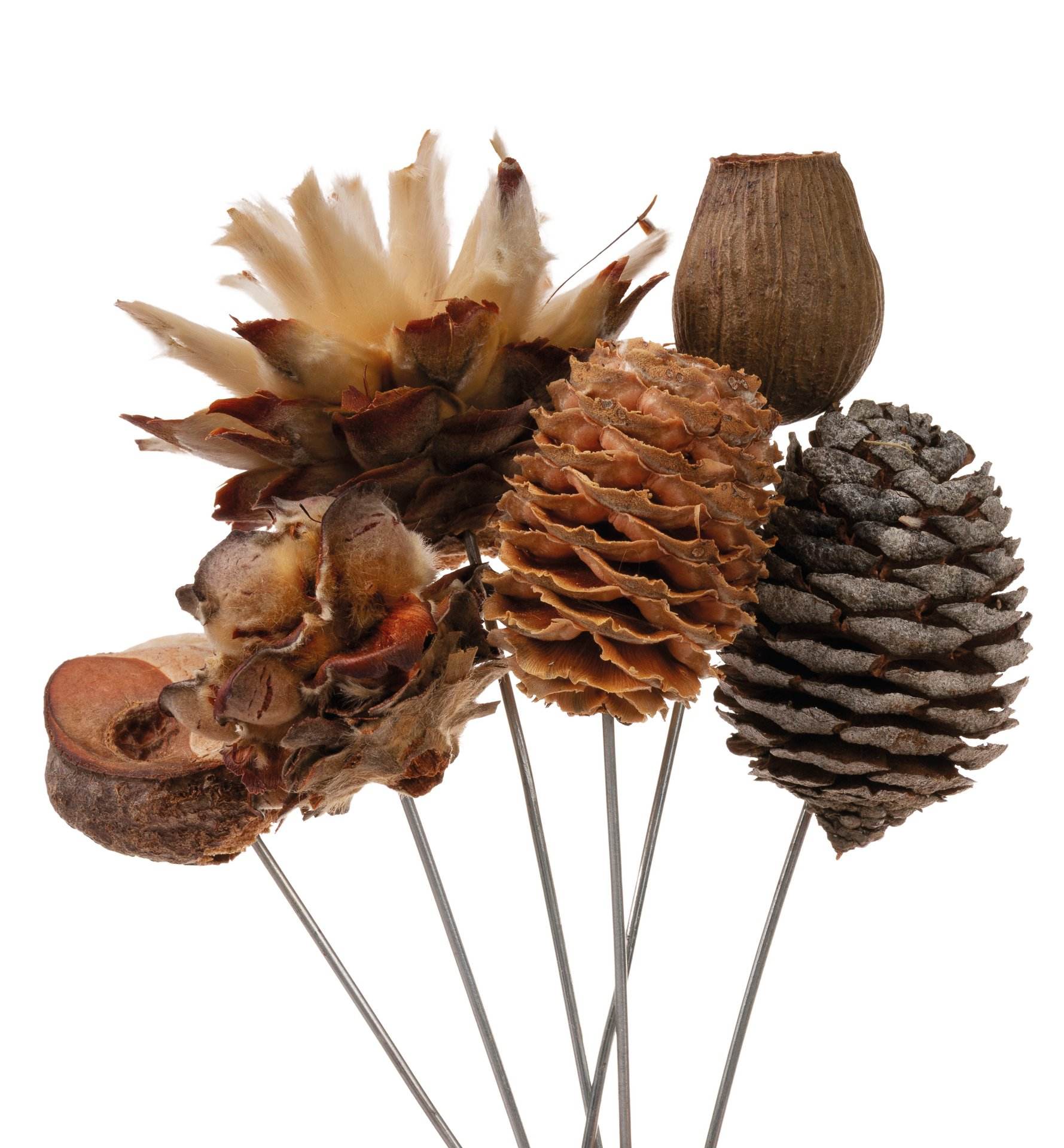 Mélange de cônes de leucadendron sur pique livrés dans une boîte pratique. Dimensions : env. Ø 3-4 cm, pique env. 9 cm.