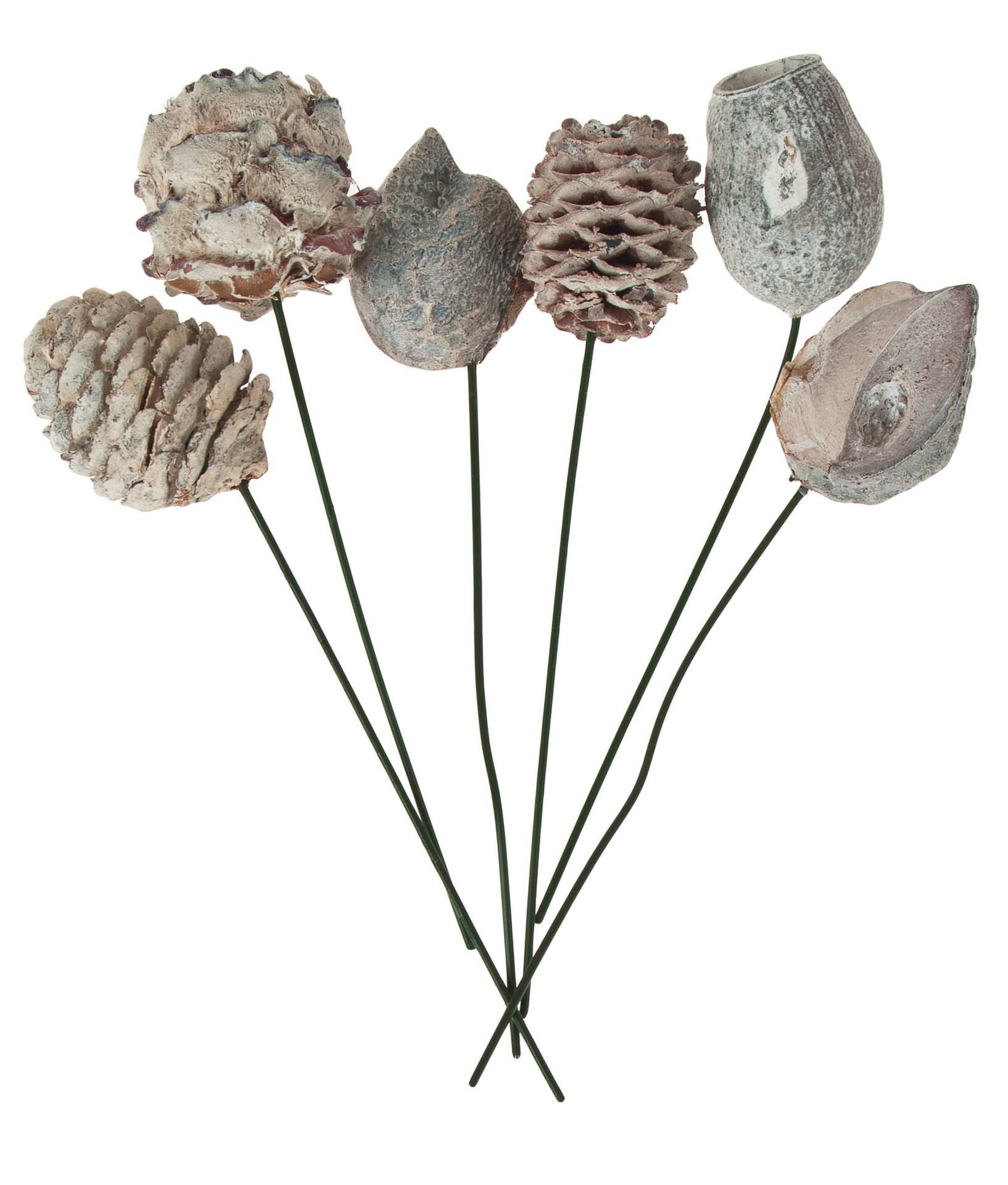 Mélange de cônes de leucadendron sur pique livrés dans une boîte pratique. Dimensions : env. Ø 3-4 cm, pique env. 9 cm.