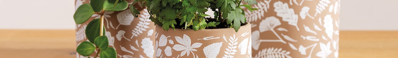 Pot en terre cuite pour plantes, avec motif de feuilles blanches.