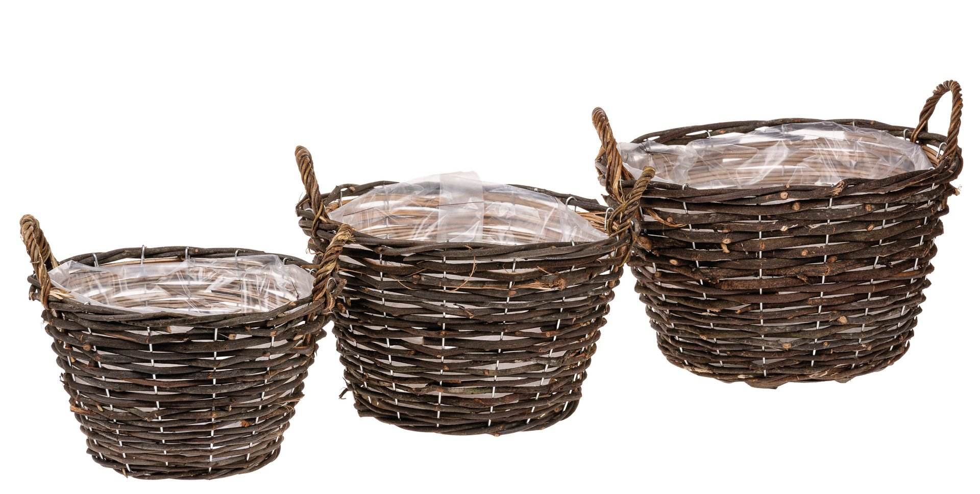 Panier à plantes rond en rotin avec anses. Intérieur recouvert d'un film plastique. Lot de 3. Dimensions : Ø 23 x 10 cm, Ø 27 x 12 cm, Ø 30 x 13 cm.