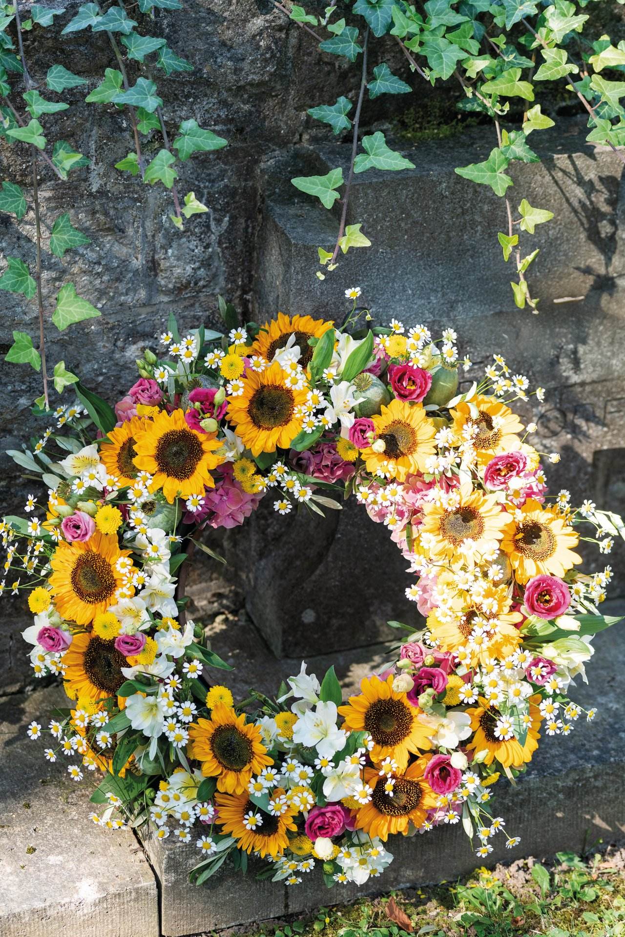 Couronne en mousse florale mouillable enveloppée de maillage, sur base en bois stable, avec bord biseauté. Diamètre intérieur: N° 113951: Ø 26,5 cm, N° 116551: Ø 39 cm, N° 116651: Ø 47 cm, N° 116751: Ø 56 cm.