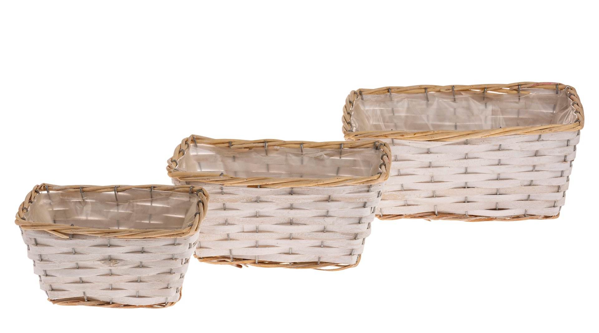Corbeille à plantes en bandes de copeaux de bois. Intérieur recouvert d'une feuille. Set de 3 pièces. Dimensions : 15 x 15 x 9 cm, 20 x 20 x 10 cm, 23 x 23 x 12cm.