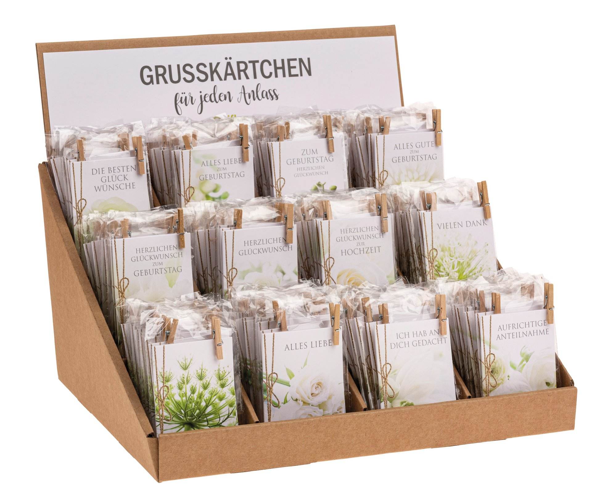 Mini-cartes avec différents motifs pour toutes sortes d'occasions. Chaque carte est munie d'une pince en bois et emballée dans du cellophane dans un présentoir pratique. Le présentoir peut également être utilisé sans en-tête. Verso de l'en-tête vierge. Contenu : 1 présentoir avec 144 cartes - assortiment de 12 (12 x 12 cartes). (en allemand uniquement )