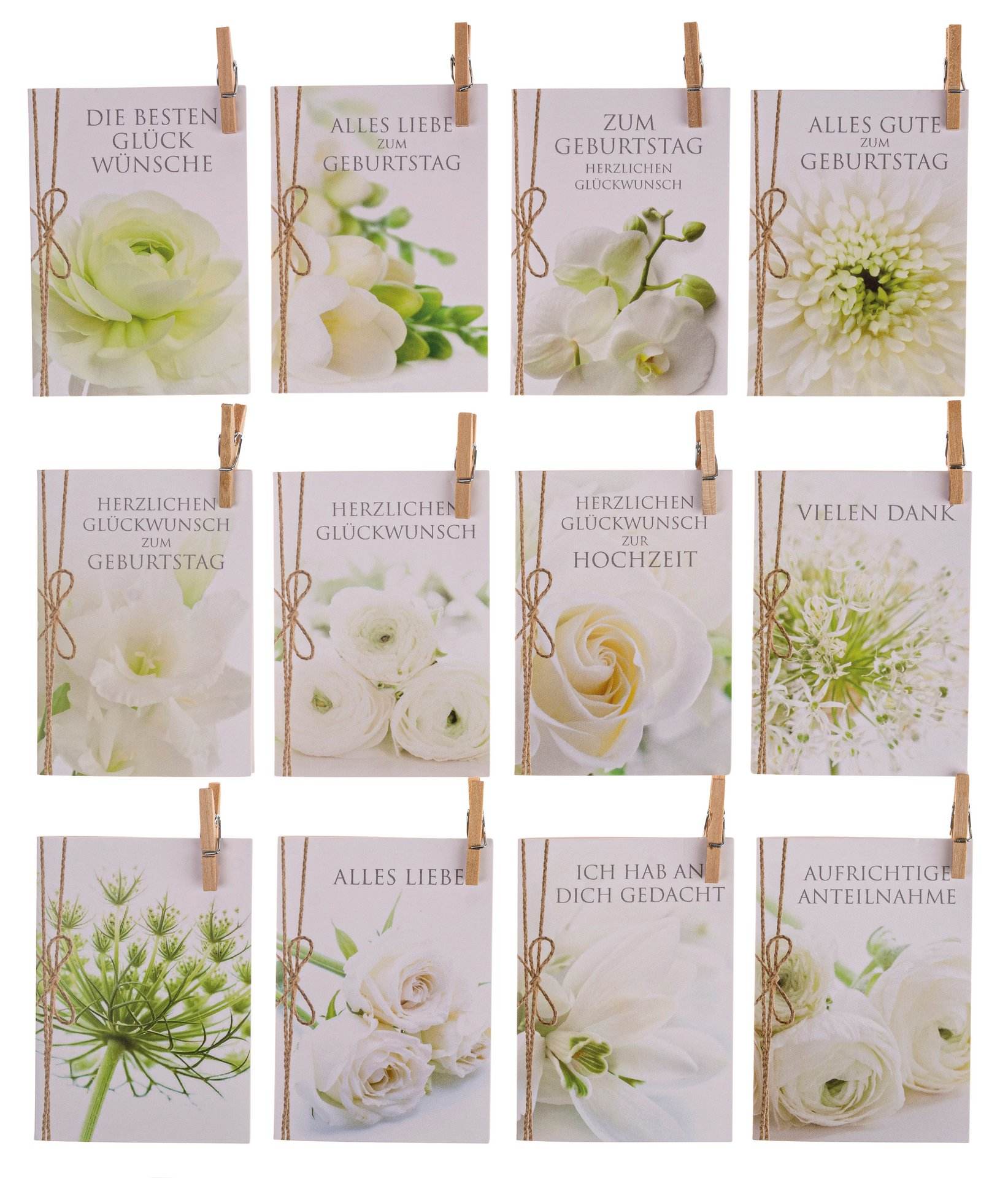 Mini-cartes avec des motifs photo intemporels pour toutes sortes d'occasions. Chaque carte est livrée avec une pince en bois et un emballage cellophane dans un présentoir pratique. Le présentoir peut également être utilisé sans en-tête. Verso de l'en-tête vierge. Contenu : 1 présentoir de 144 cartes - 12 fois assorties (12 x 12 cartes). (en allemand uniquement )