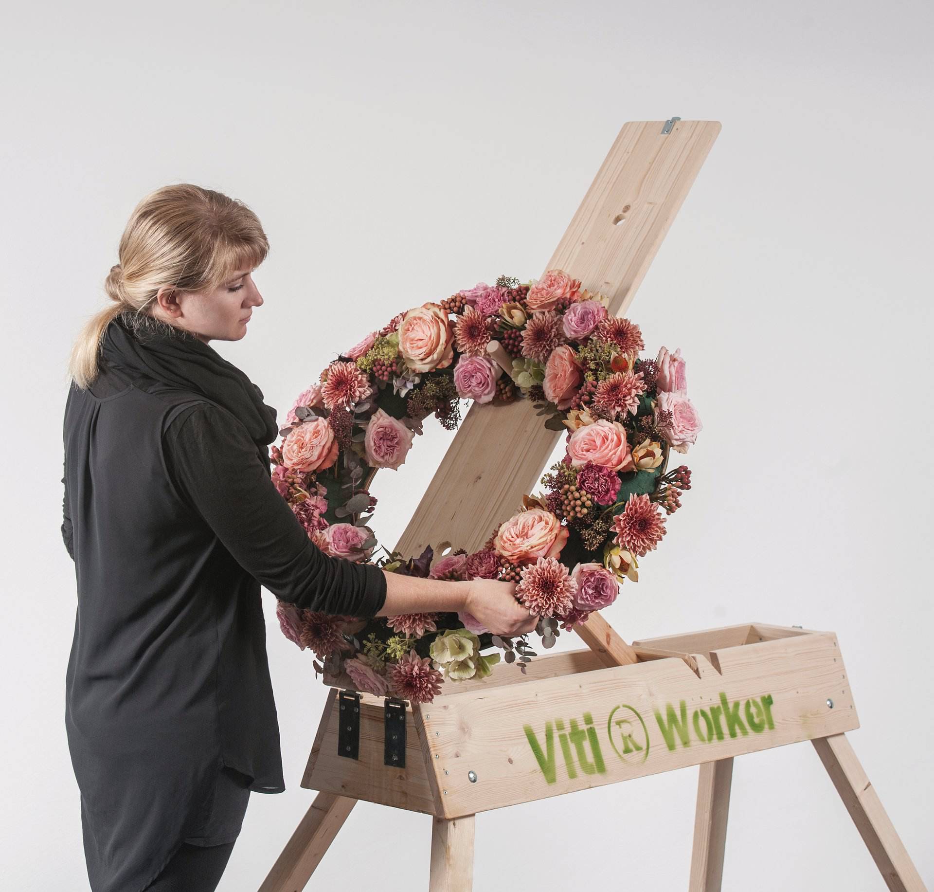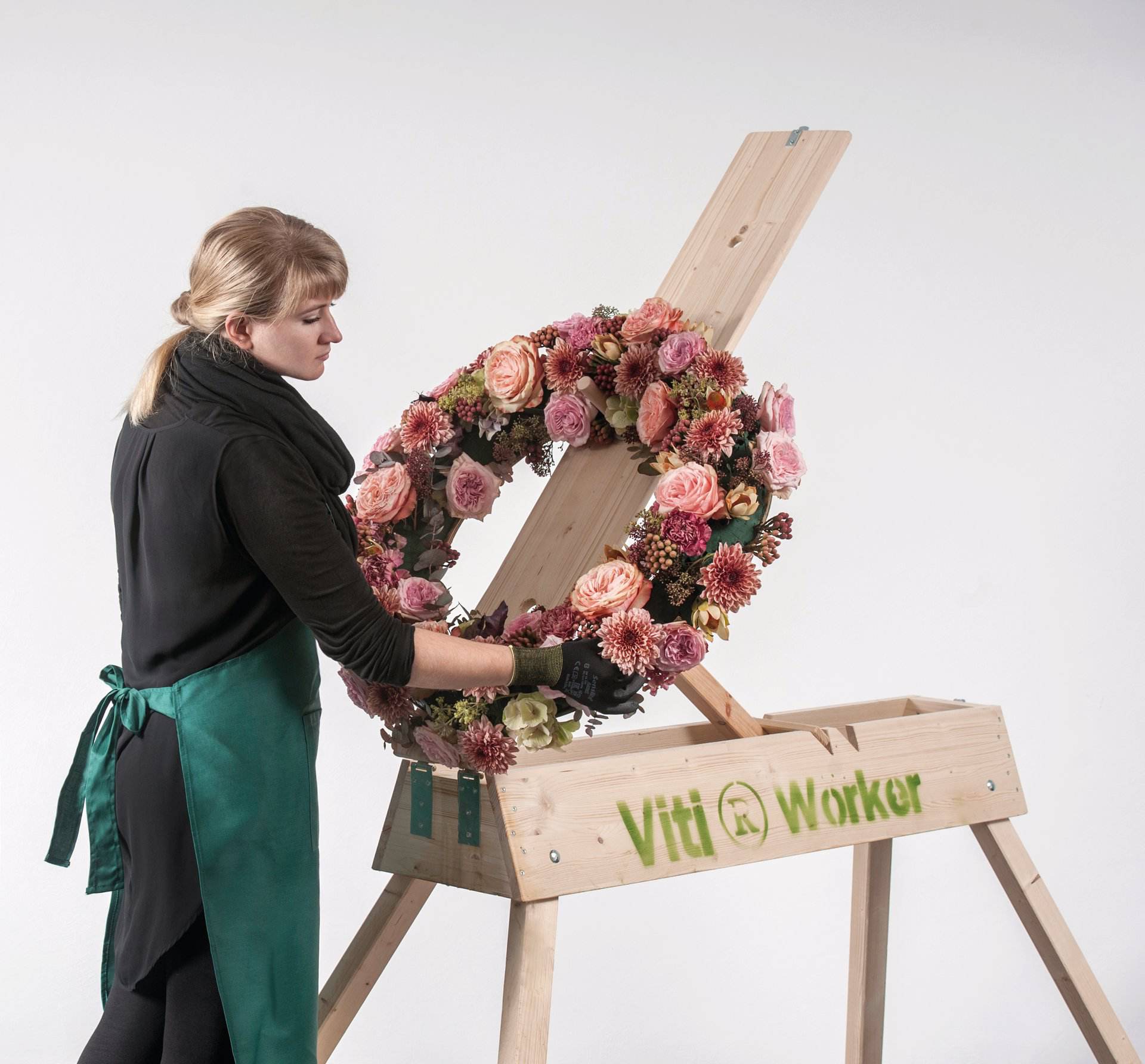 Le VITI®WÖRKER vous aidera pour un tout petit prix à présenter vos compositions funéraires et couronnes. La hauteur est modulable selon la taille de la couronne. Il est muni d'un stabilisateur pour la couronne. L'angle d'inclinaison est également modulable. Parfait de par sa forme cercueil, il est équipé de Vitifix (N° 194935) pour éviter que la décoration du cercueil ne glisse. Pliant, facile à transporter, même en voiture. Hauteur maximale : 2 mètres.
