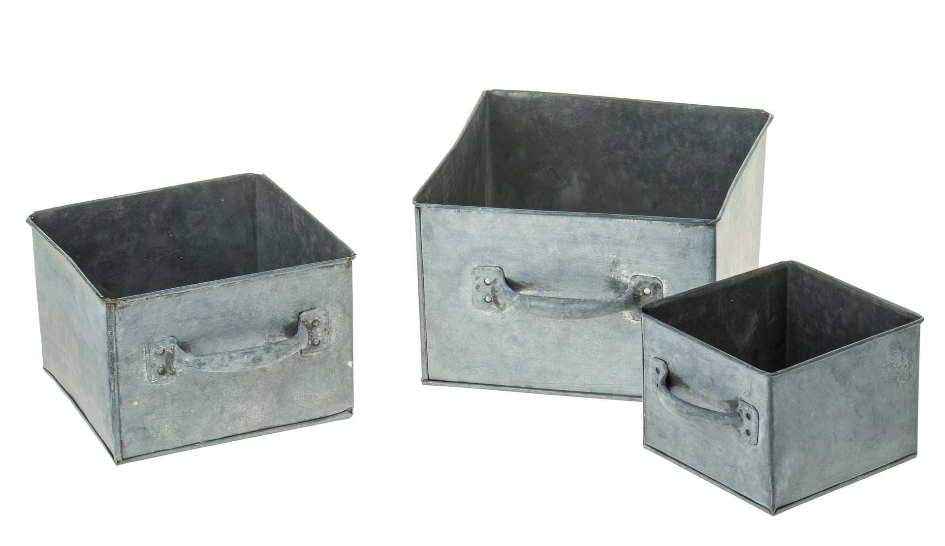 Tiroirs carrés en zinc avec poignée. Set de 3 pièces. Dim. : 13 x 13 x 10 cm, 17 x 17 x 12 cm, 20 x 20 x 14 cm.