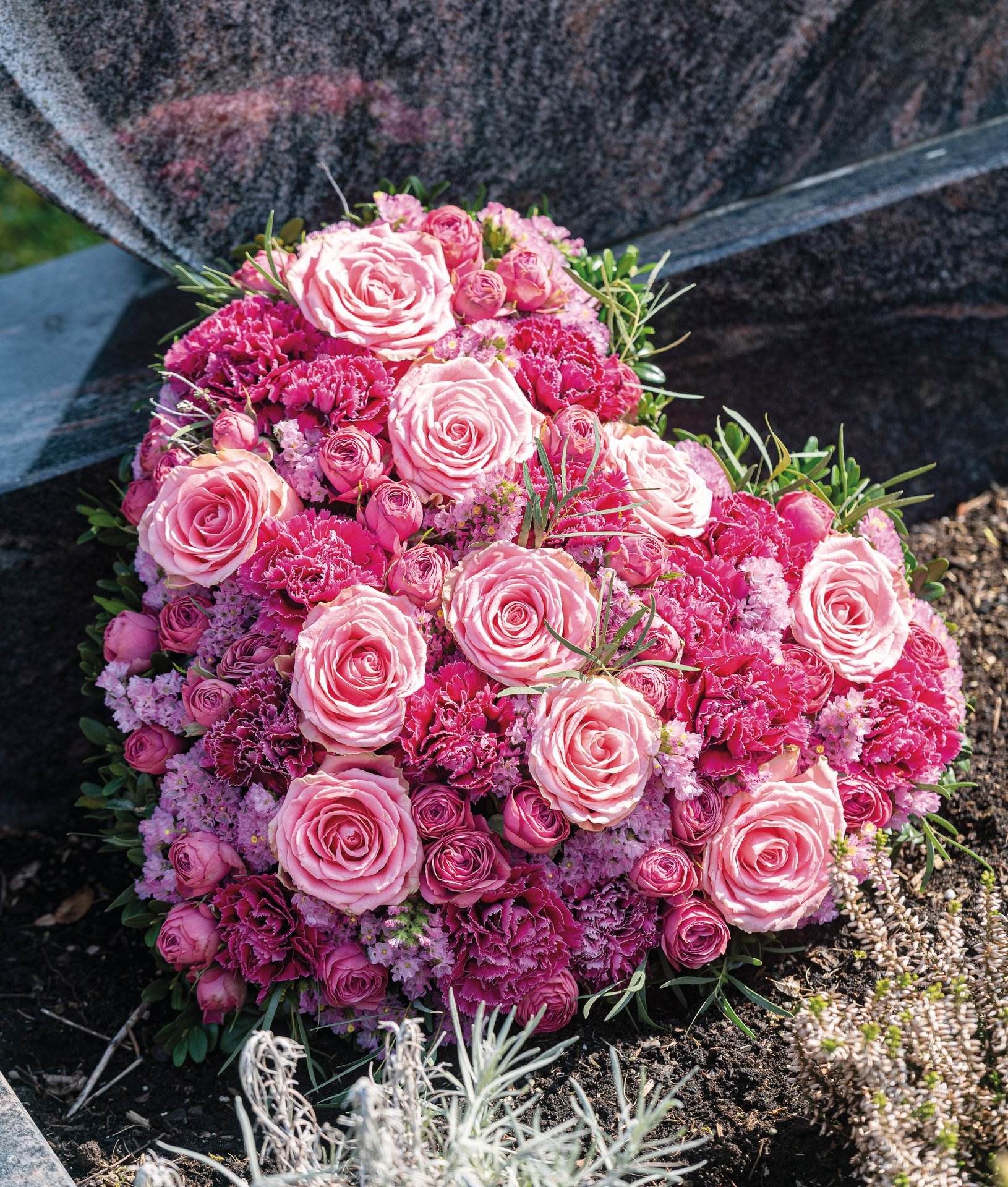 Nass-Steckschaumherz auf stabiler, verrottbarer Holzunterlage, zum Stellen.