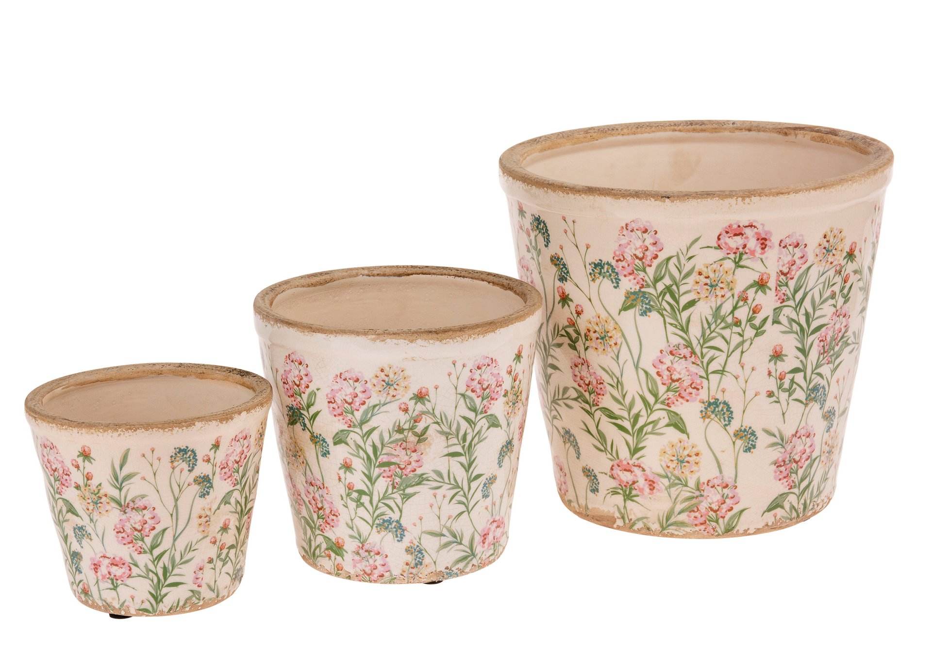 Übertopf aus Steinzeug mit Blumenprint. 3er Set. Größen: Ø 12 x 10,5 cm, Ø 14,5 x 14 cm und Ø 21 x 20 cm.
