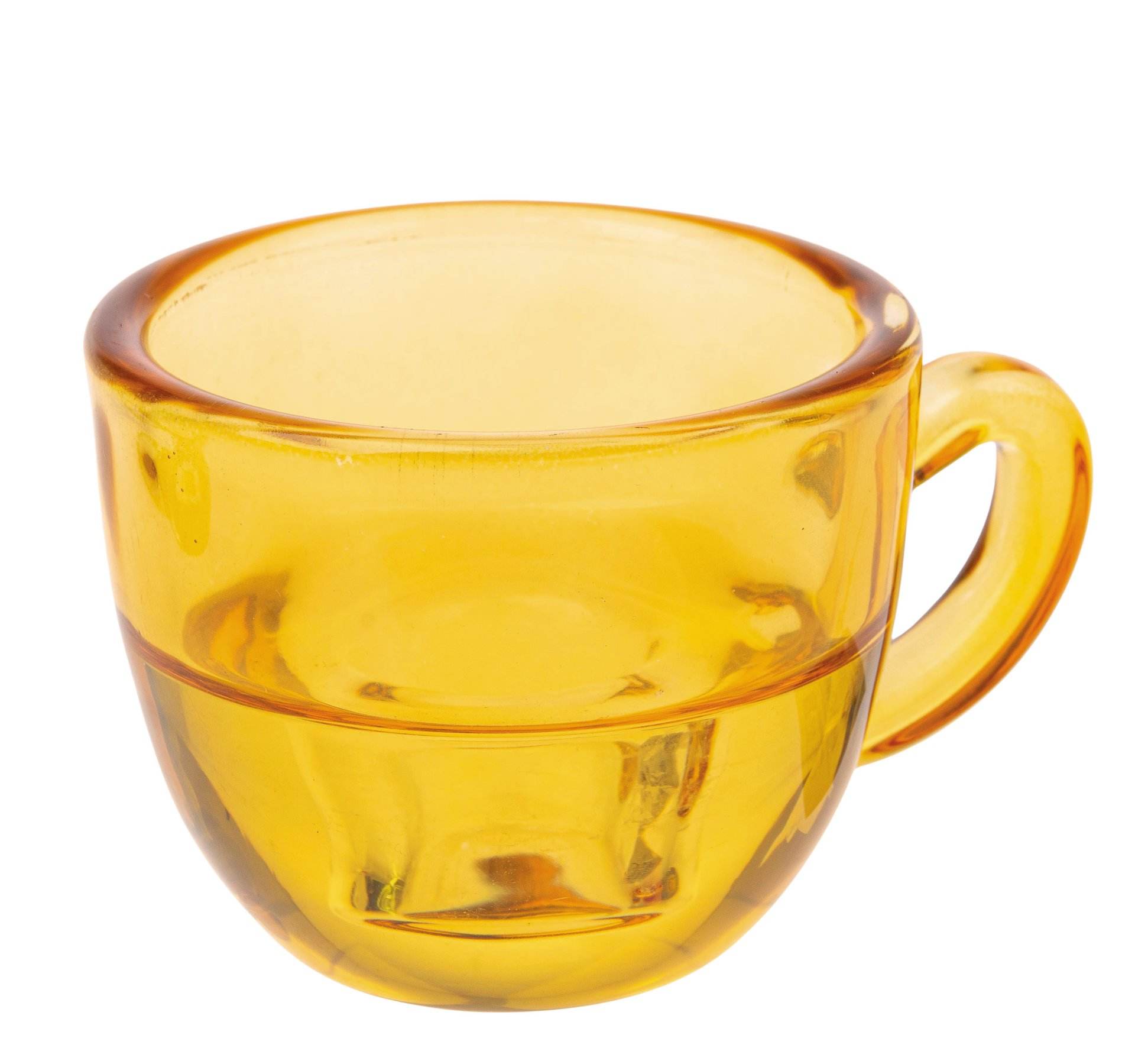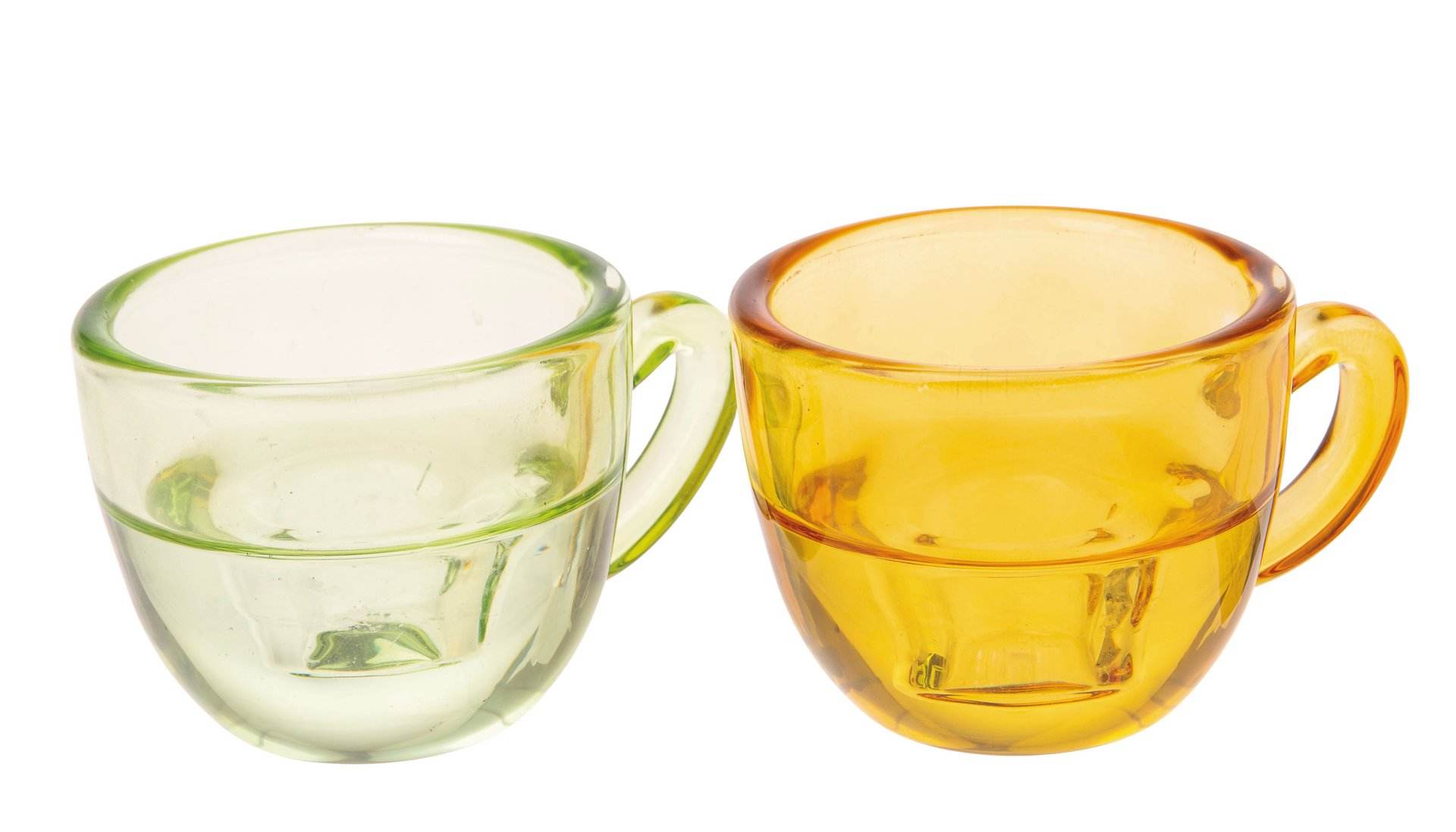 Kerzenhalter aus farbigem Glas in Form einer Tasse. Geeignet für Stabkerzen mit einem Durchmesser von 2,2 cm.