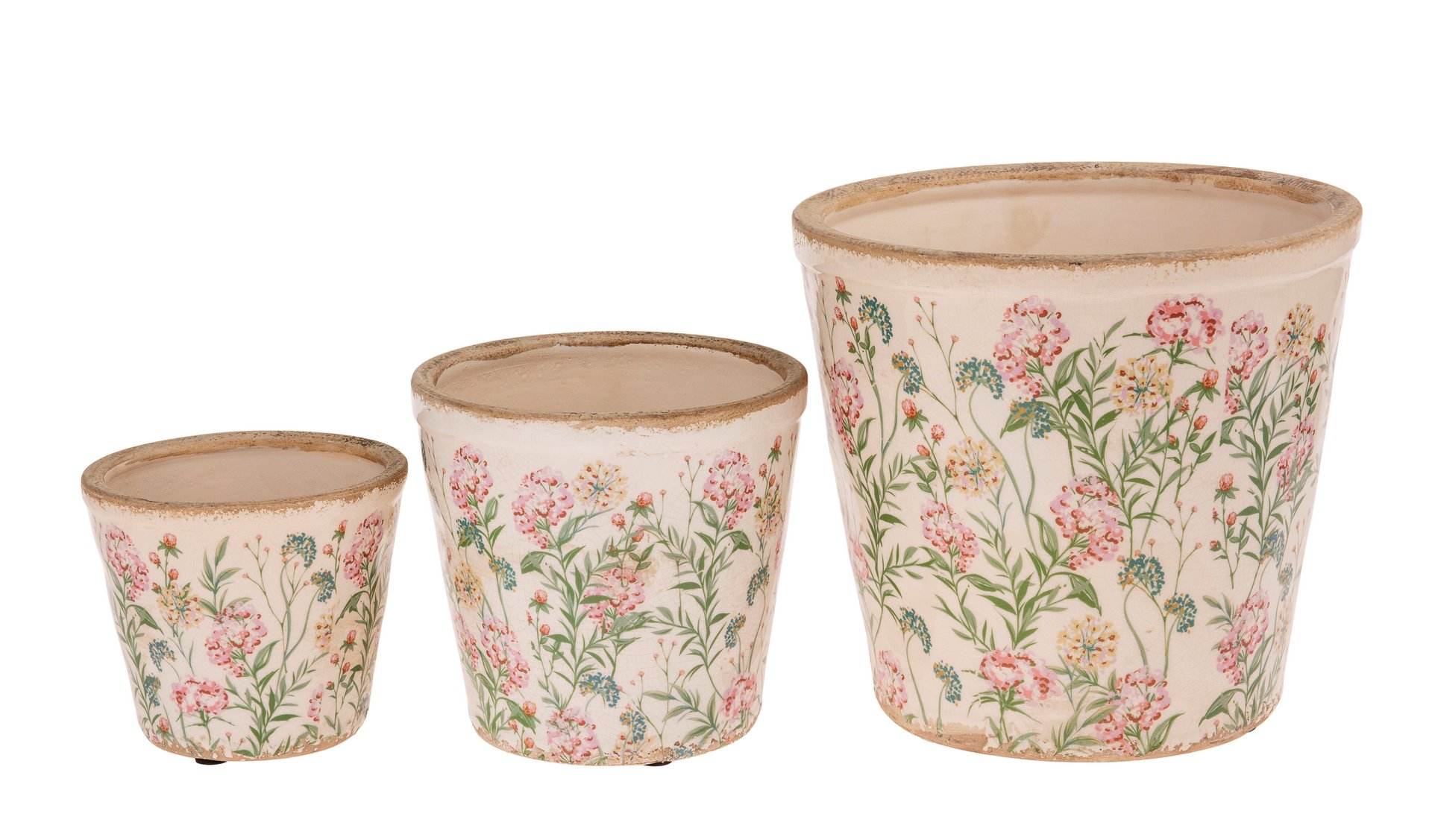 Übertopf aus Steinzeug mit Blumenprint. 3er Set. Größen: Ø 12 x 10,5 cm, Ø 14,5 x 14 cm und Ø 21 x 20 cm.