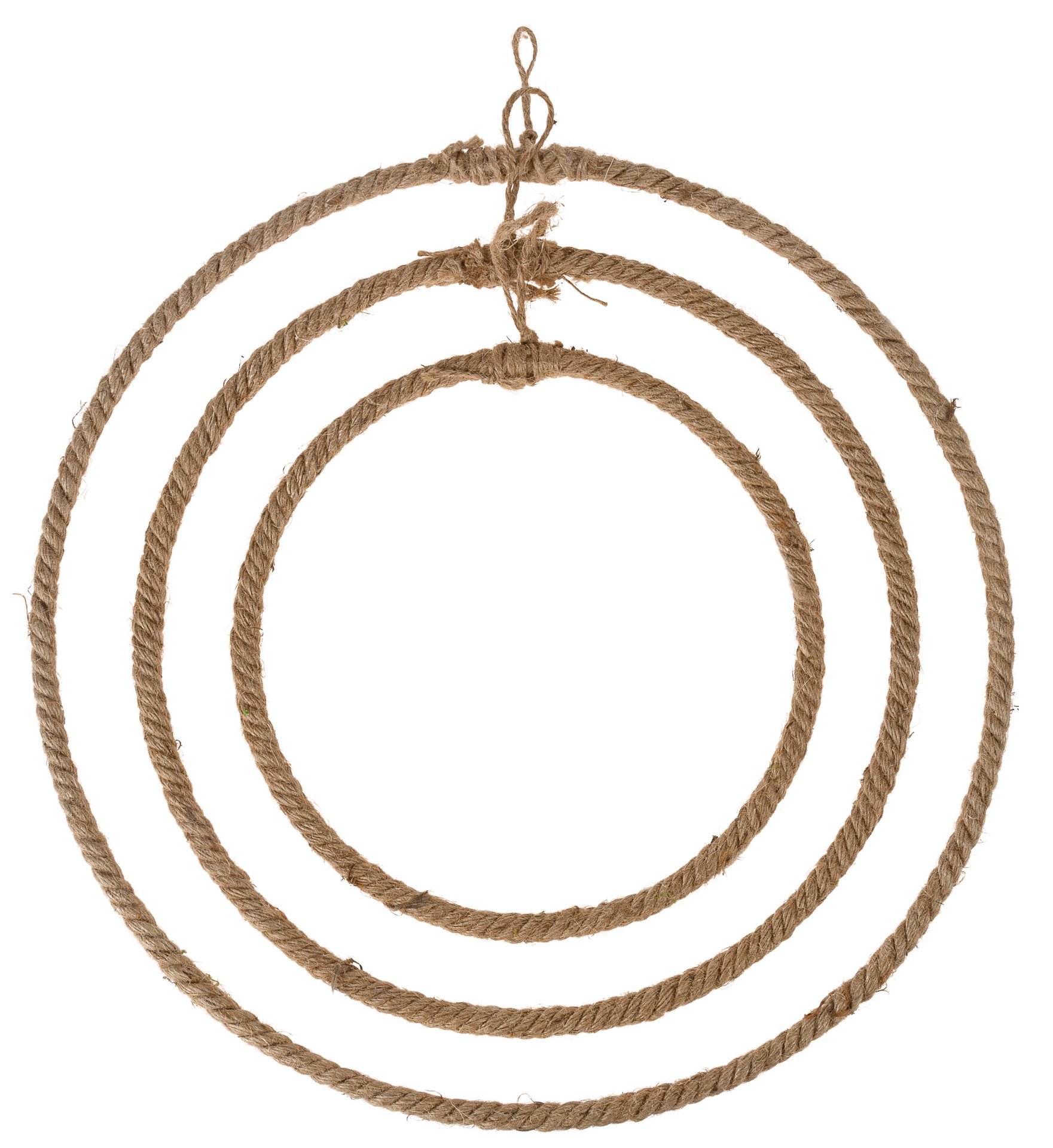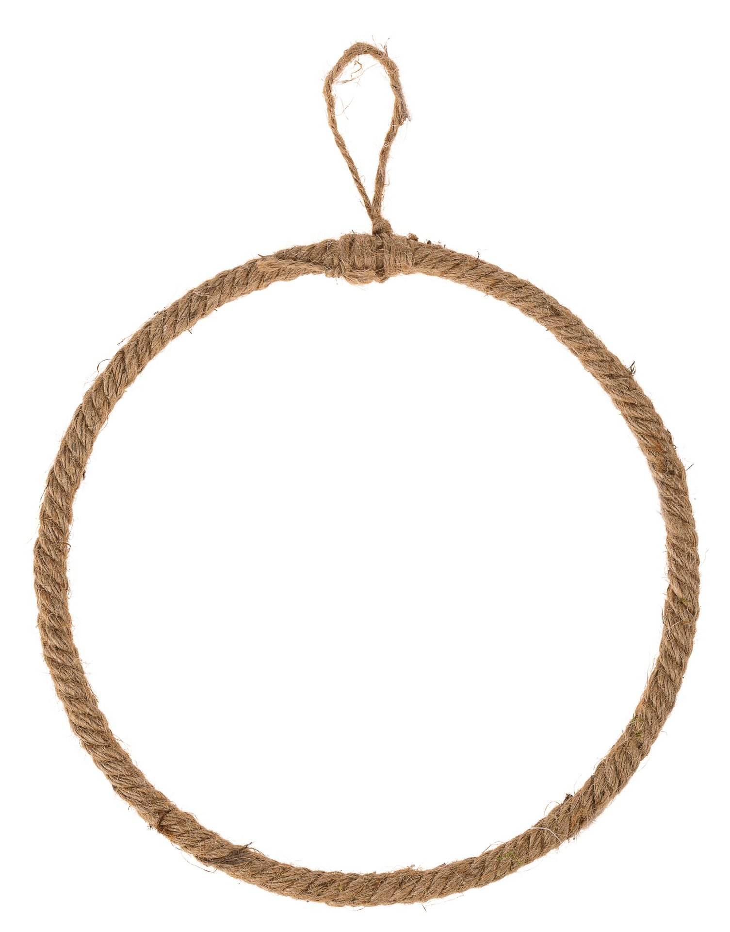 Anello in filo metallico avvolto con juta per essere appeso.