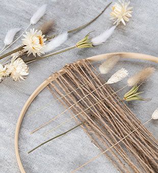 2. Con fiori secchi a scelta, infilare il filo di juta alternando i gambi dei fiori in ogni filo.