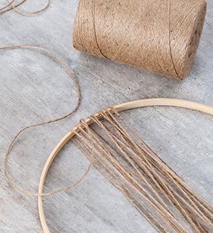 1. Avvolgete il cerchio di legno più volte al centro con un filo di juta e fissate un altro nastro in cima per appenderlo.