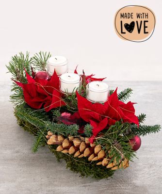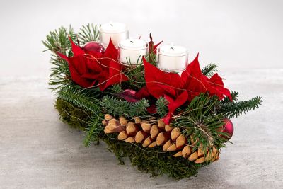3. Ora potete decorare la vostra tavola con vari tipi di abete e con la Stella di Natale. e la Stella di Natale. Non dimenticate che la stella di Natale tagliata deve essere fiammeggiata al l'area tagliata per evitare che l'euforbia fuoriesca.