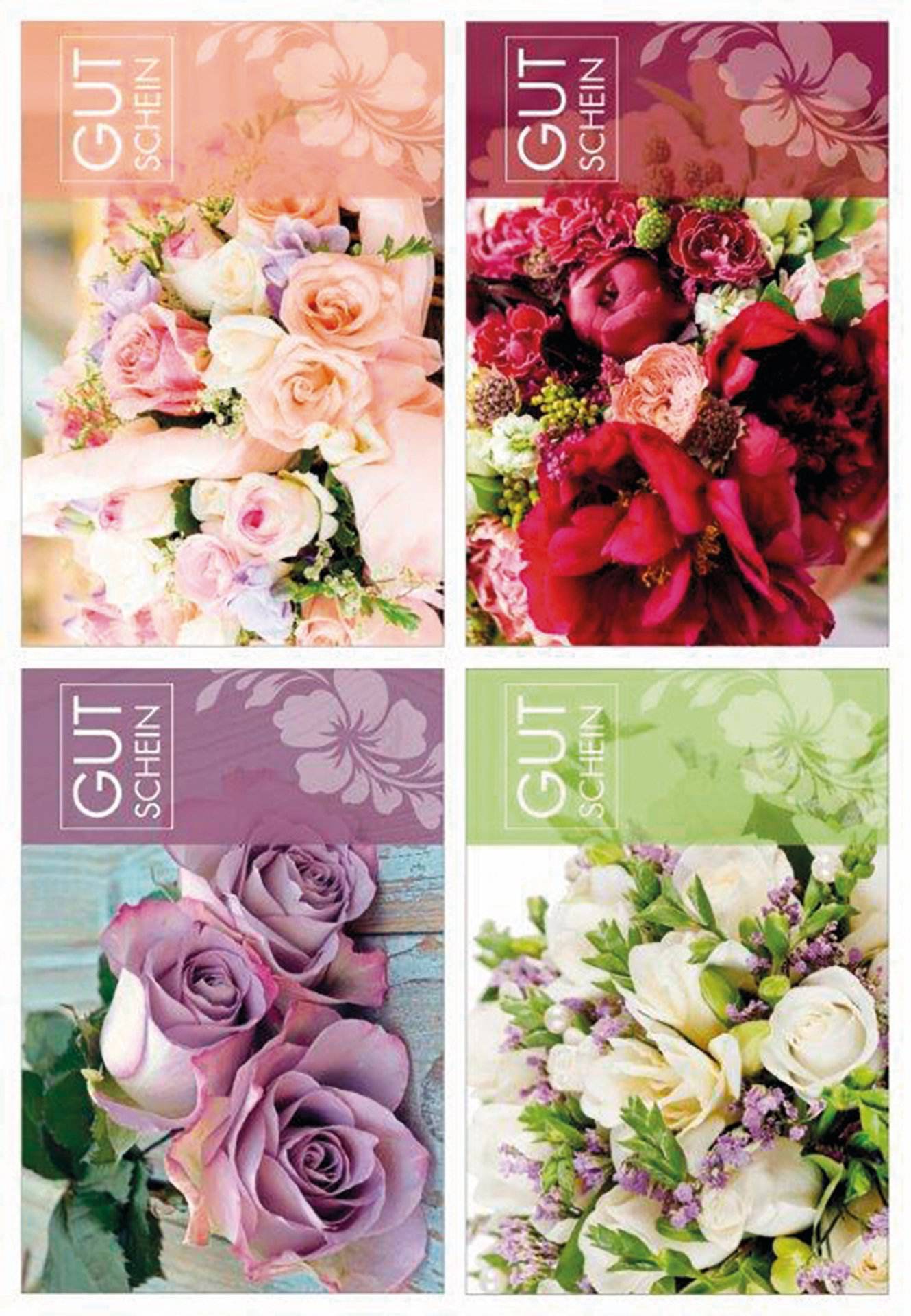 Buoni regalo eleganti in formato cartolina con busta bianca. Lato posteriore con spazio prestampato per valore, data, numero del buono e timbro dell'azienda. 4 motivi, 20 biglietti a motivo. Scritte in lingua tedesca.