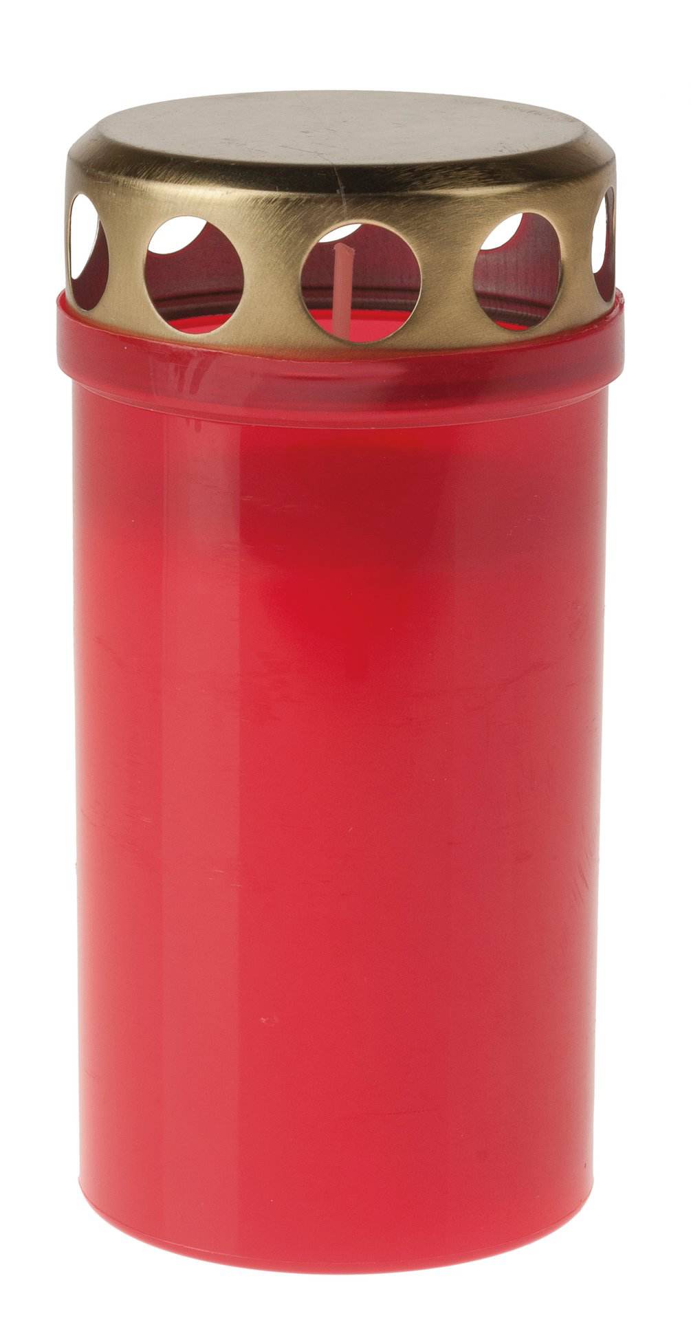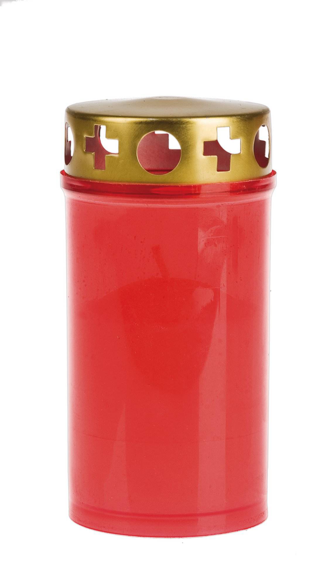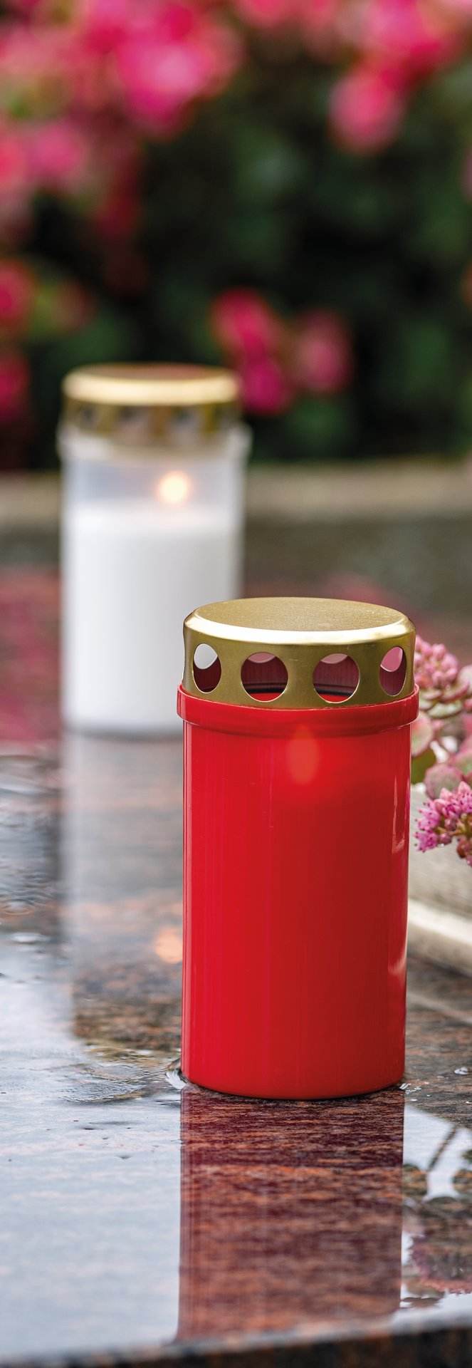 Candela bianco con coperchio oro e motivo funereo colorato. Durata del lumino: ca. 70 ore.