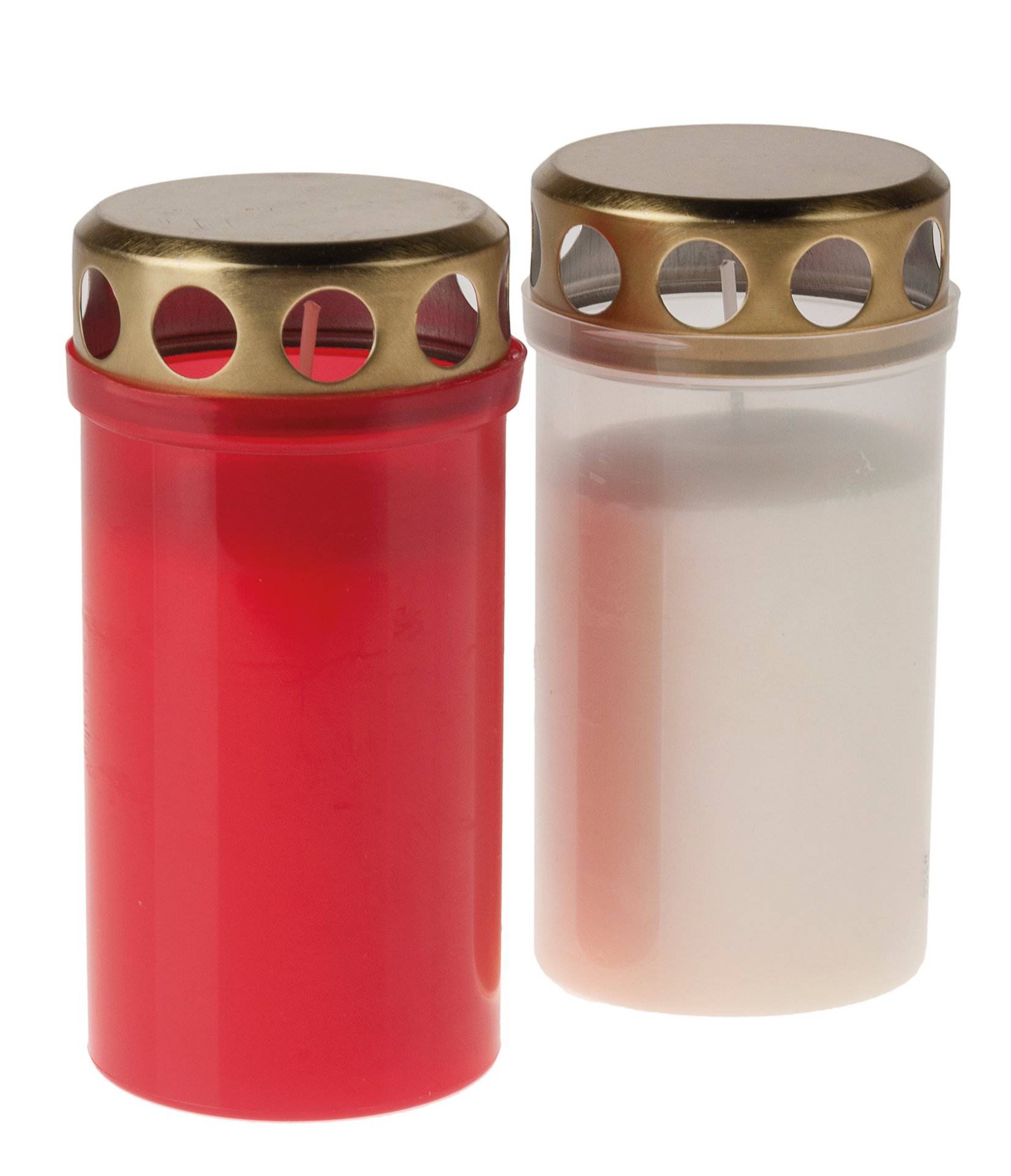 Candele per tombe riempita, bianca con motivo e coperchio dorato, durata di combustione: circa 45 ore, assortita in 3 colori.