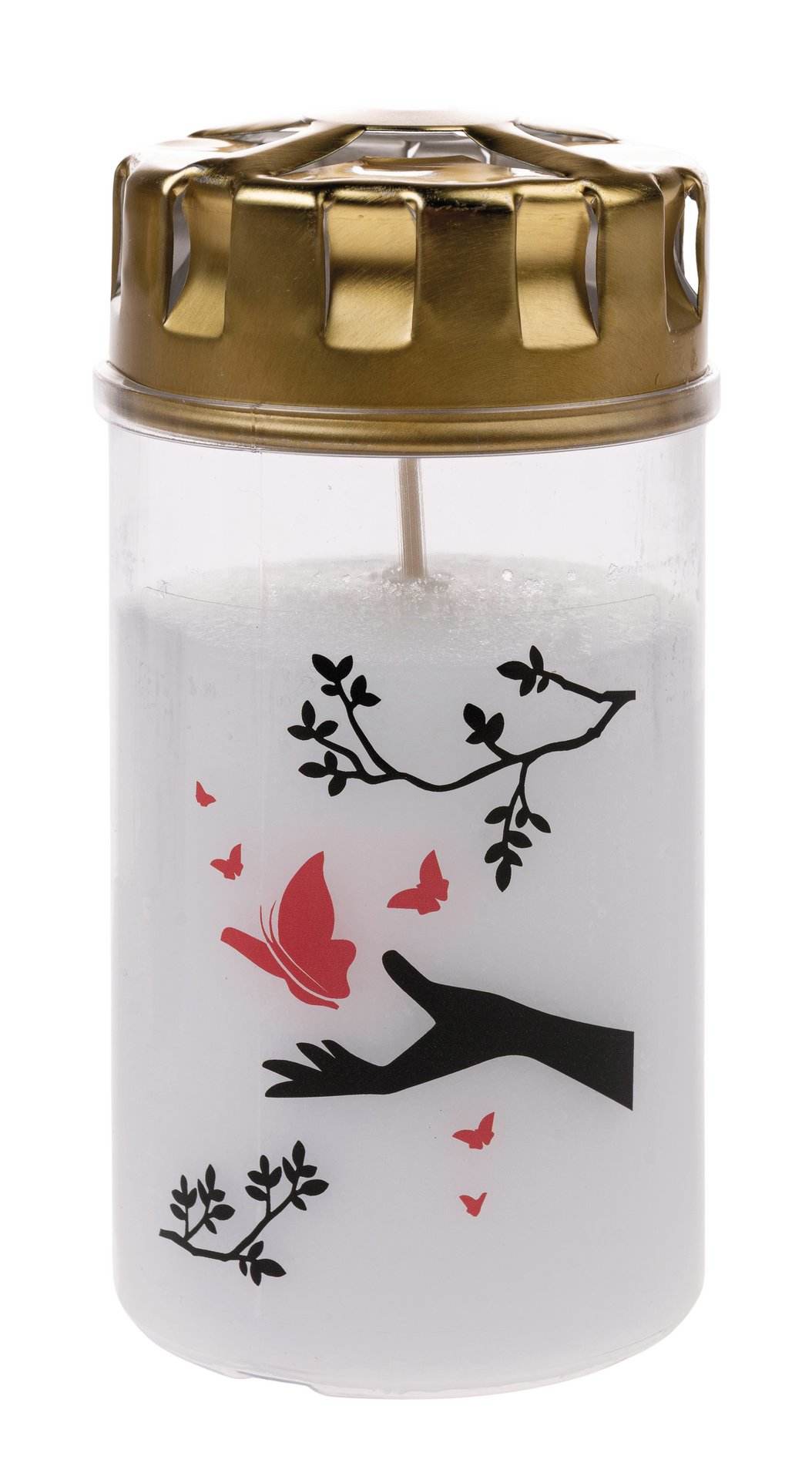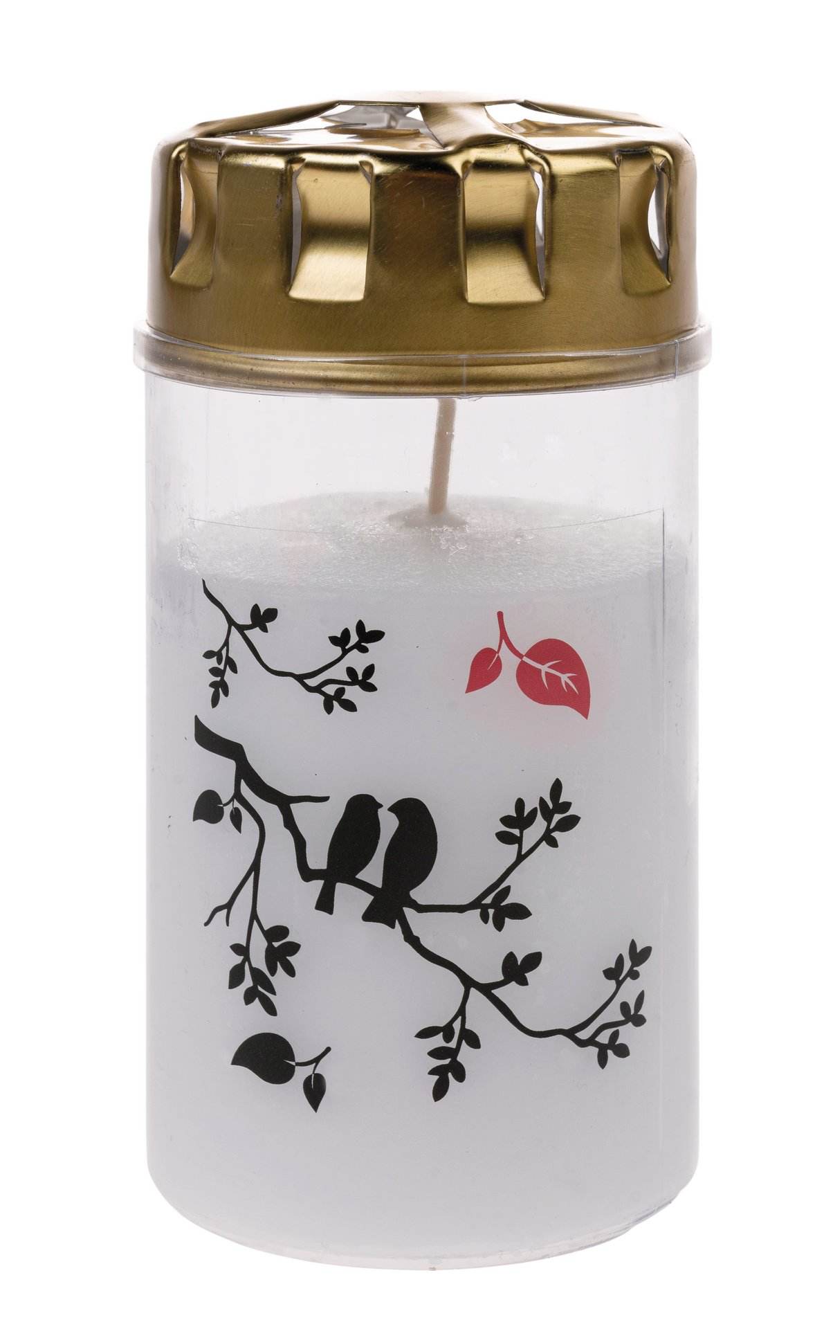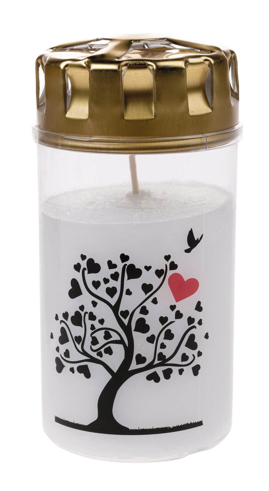 Candela bianco con coperchio oro e motivo funereo colorato. Durata del lumino: ca. 70 ore.