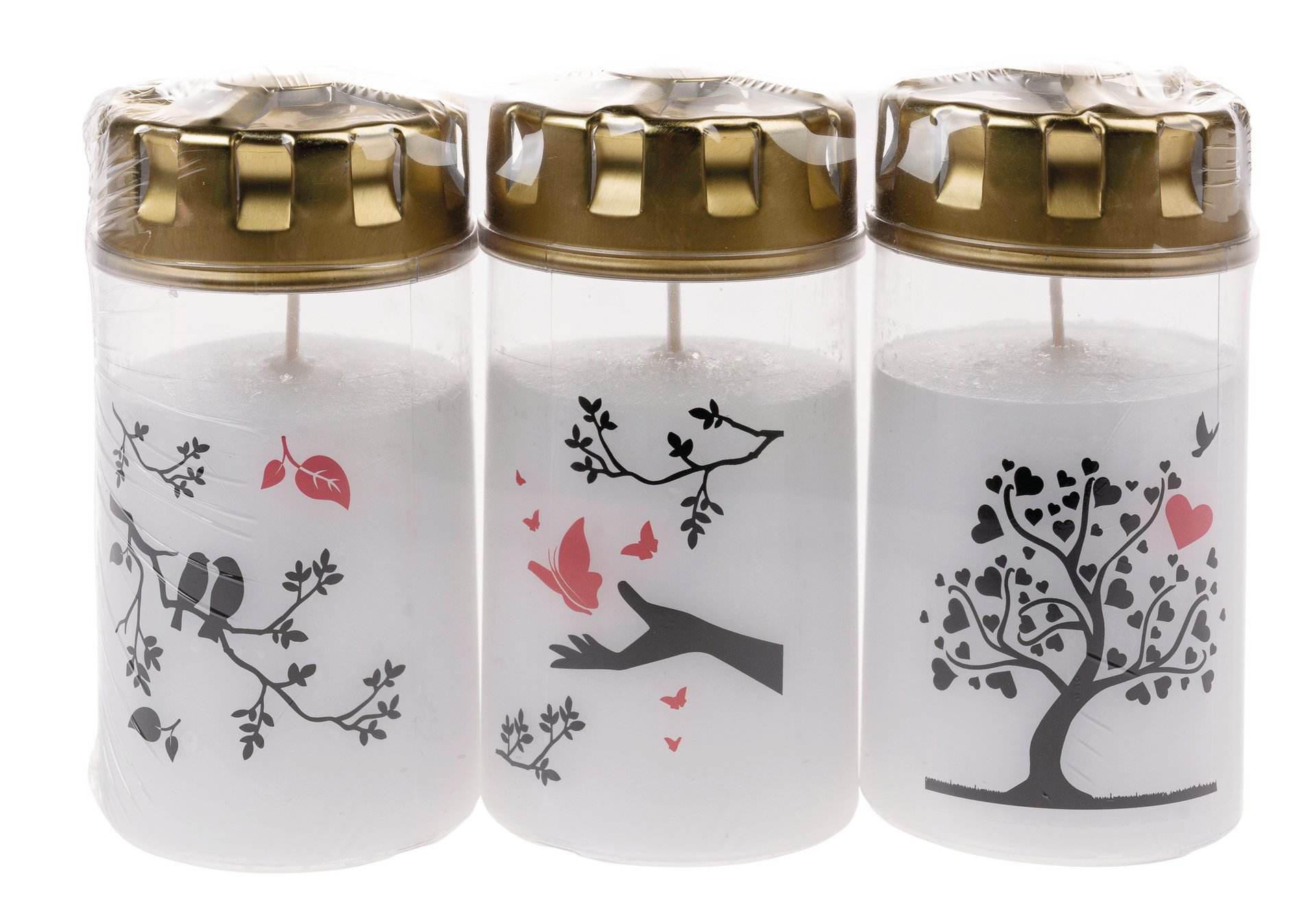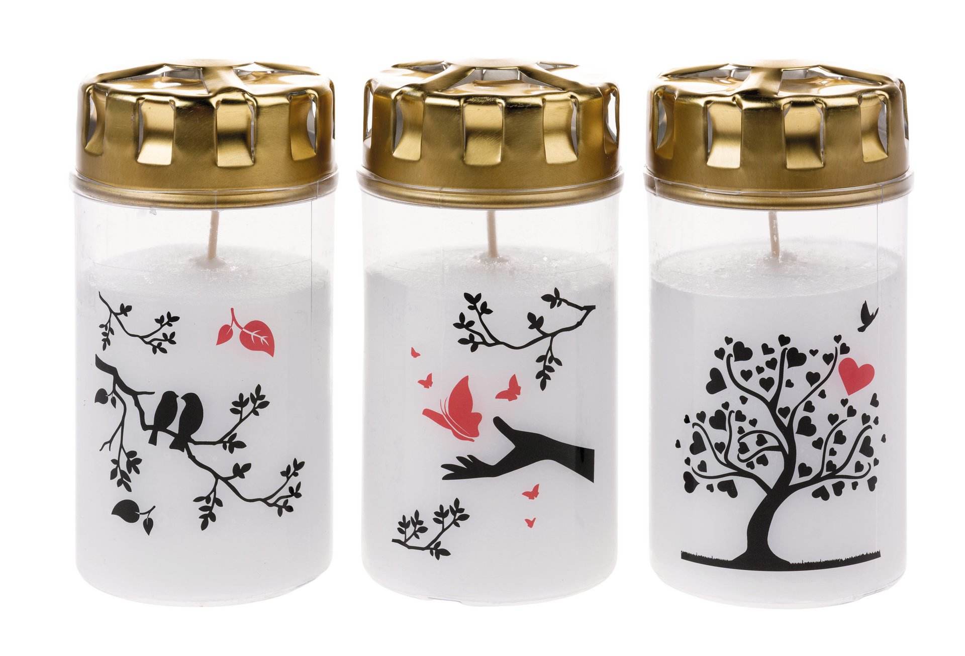 Candele per tombe riempita, bianca con motivo e coperchio dorato, durata di combustione: circa 45 ore, assortita in 3 colori.