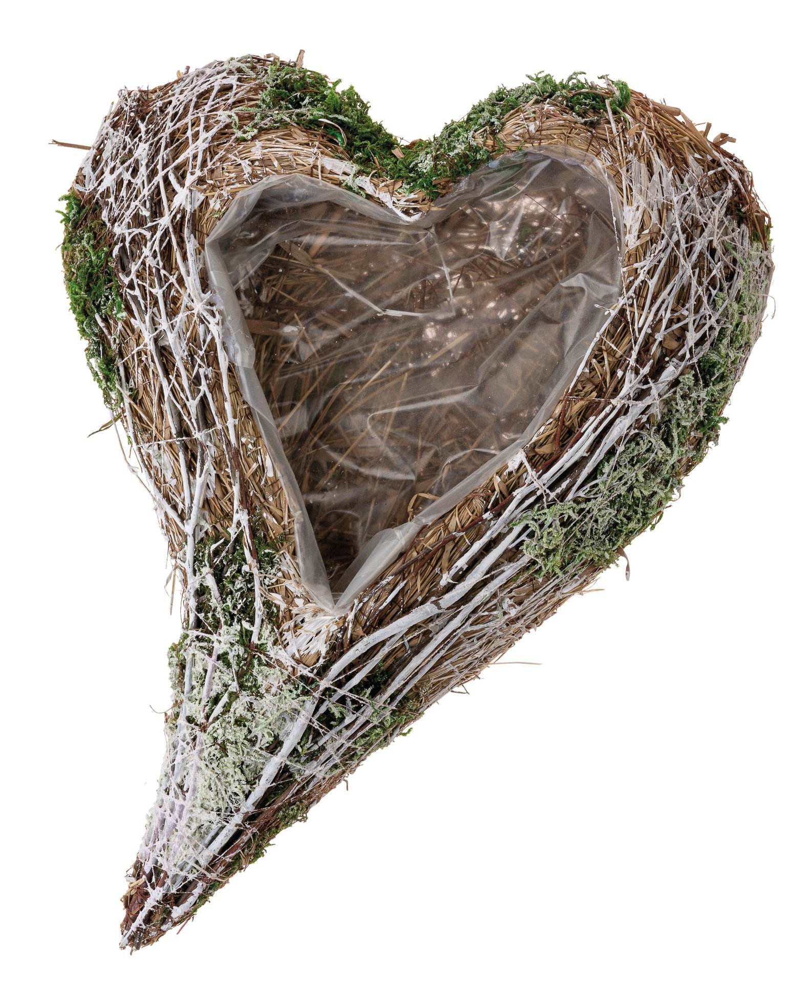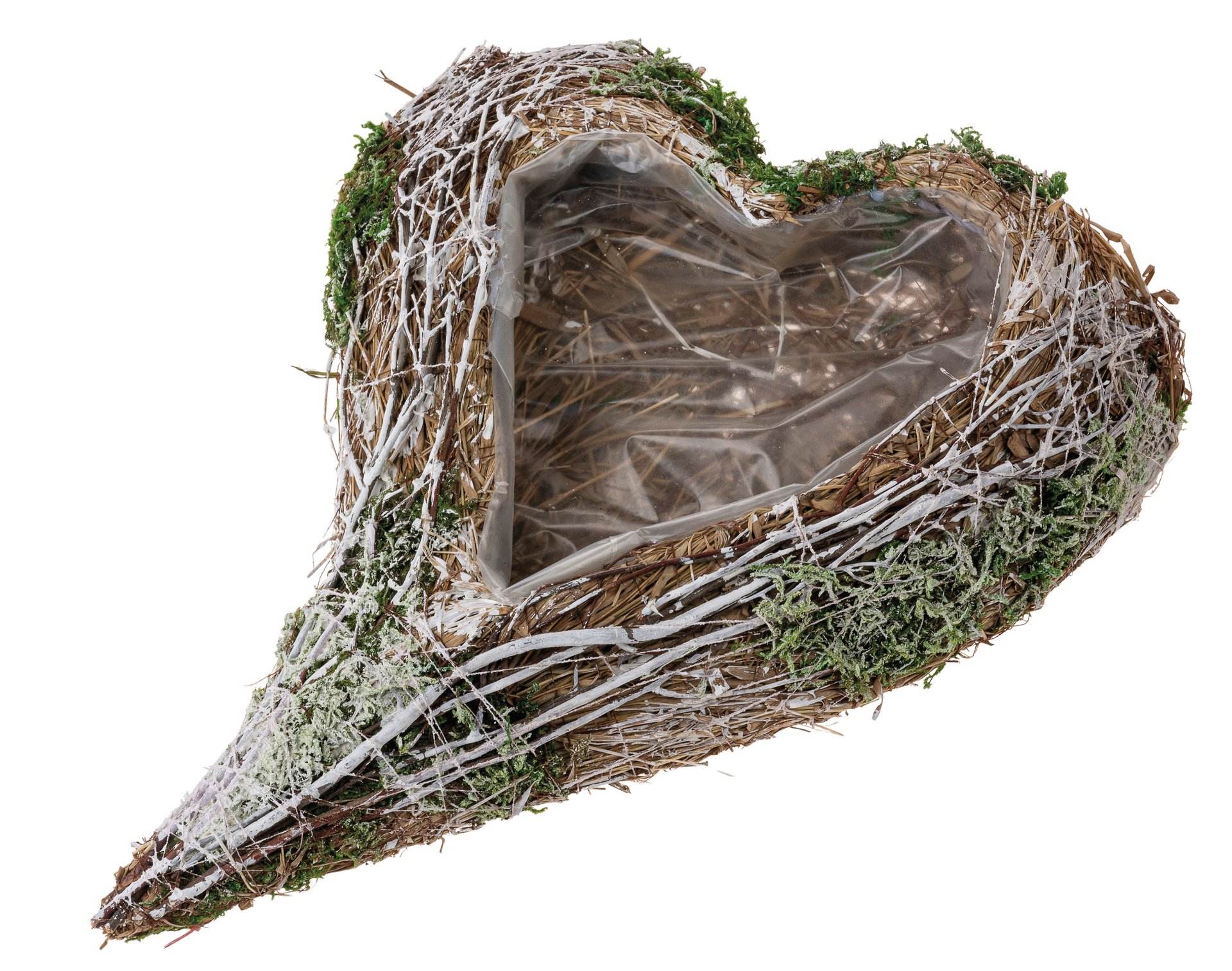 Cesto a forma di cuore in muschio e rami per piante, rivestito all'interno.
