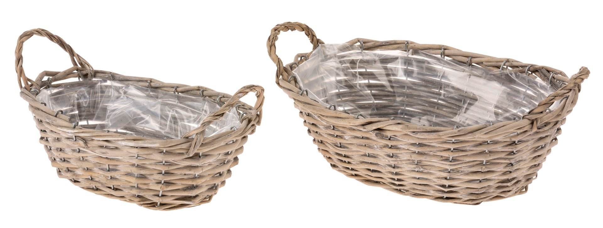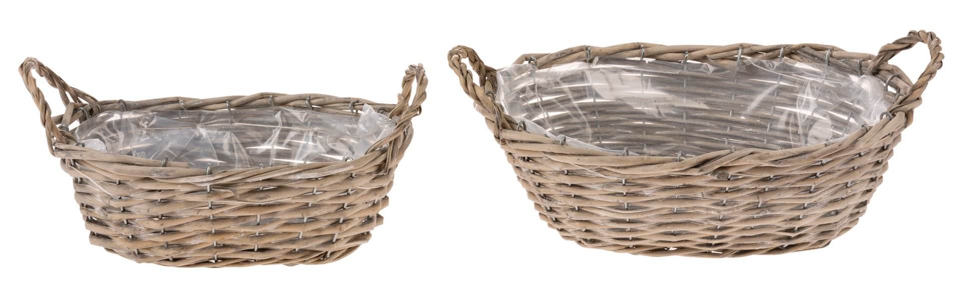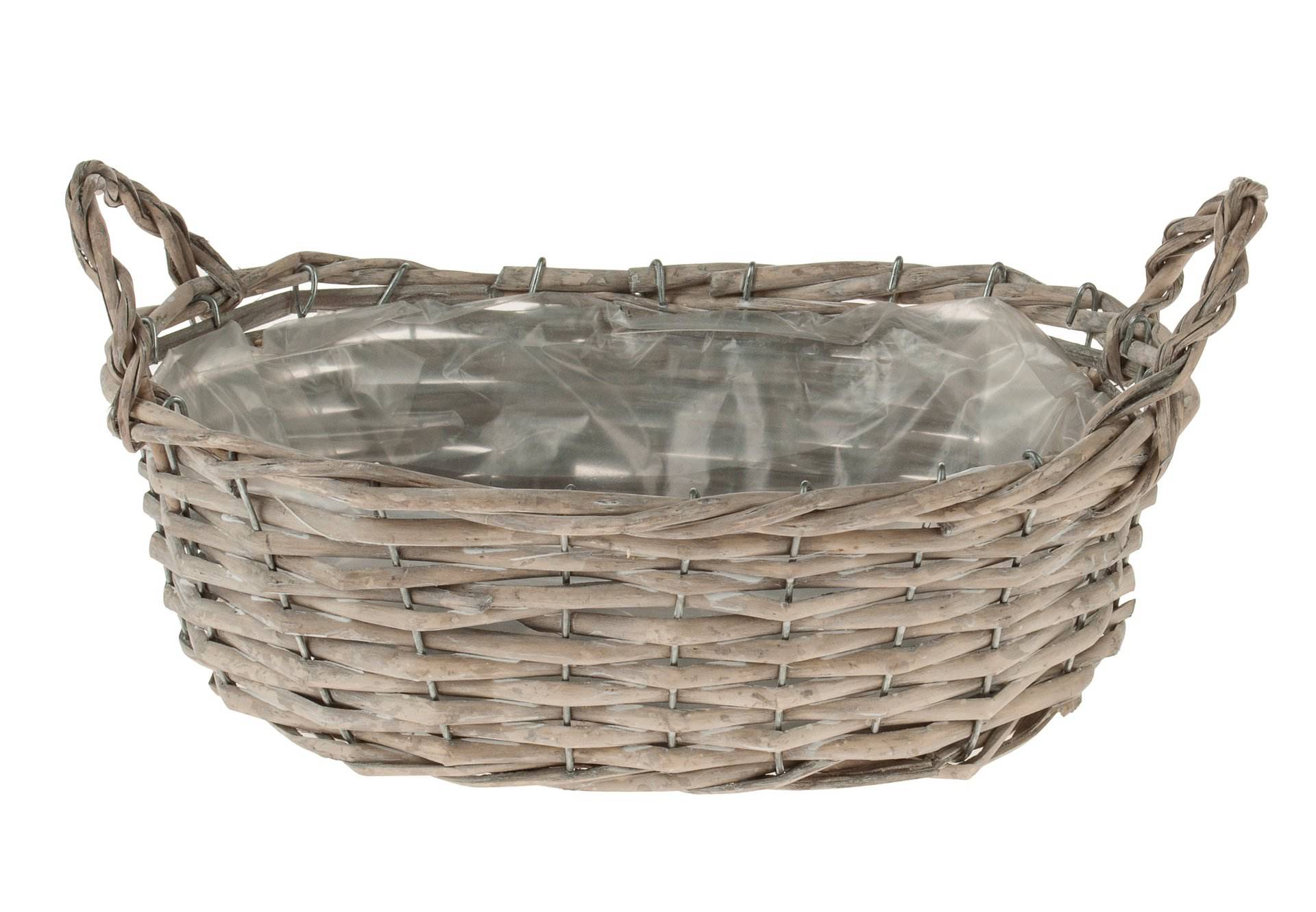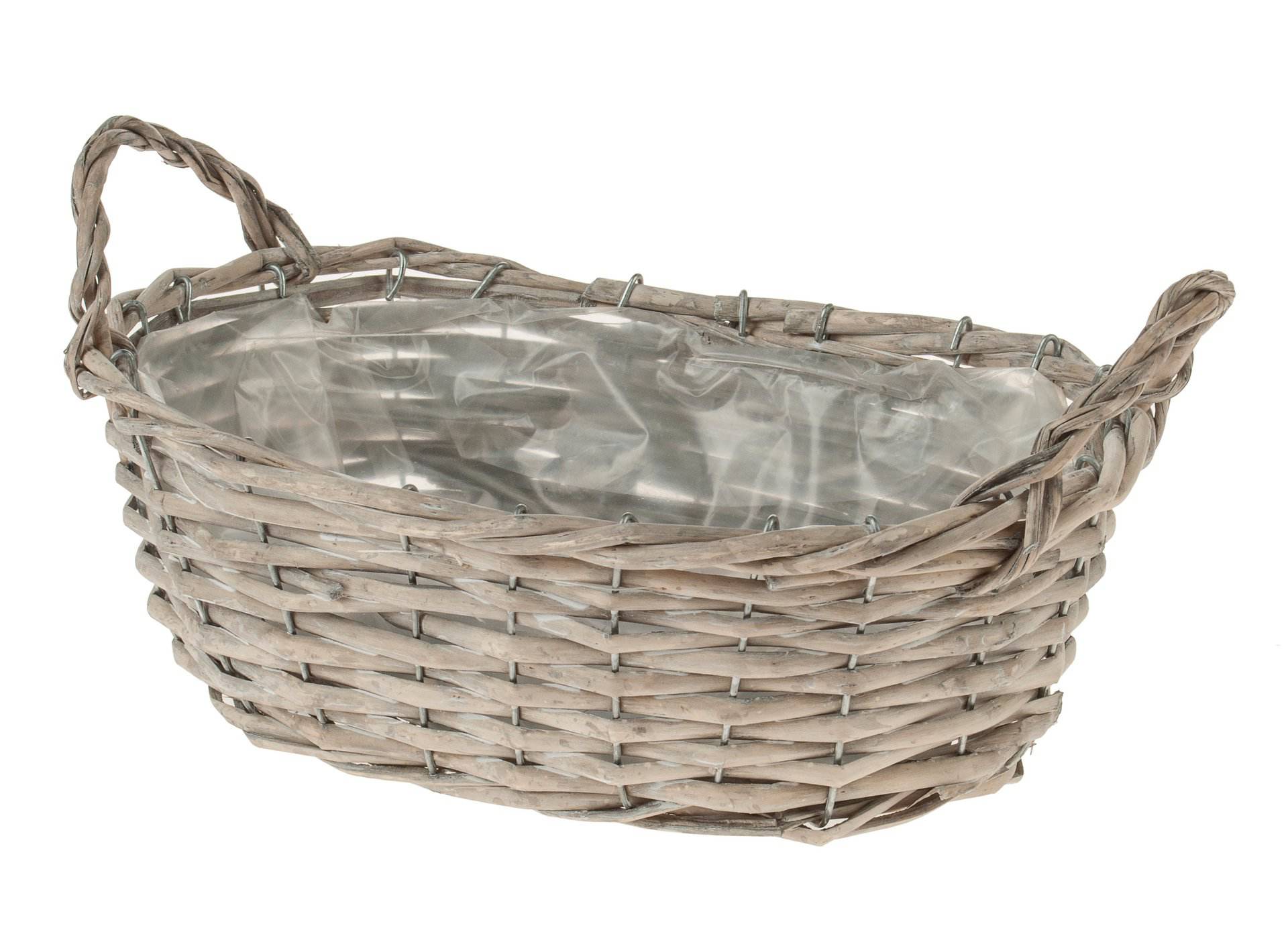Cesto ovale di salice grigio spaccato in bianco calcinato con due manici. Rivestito all´interno.