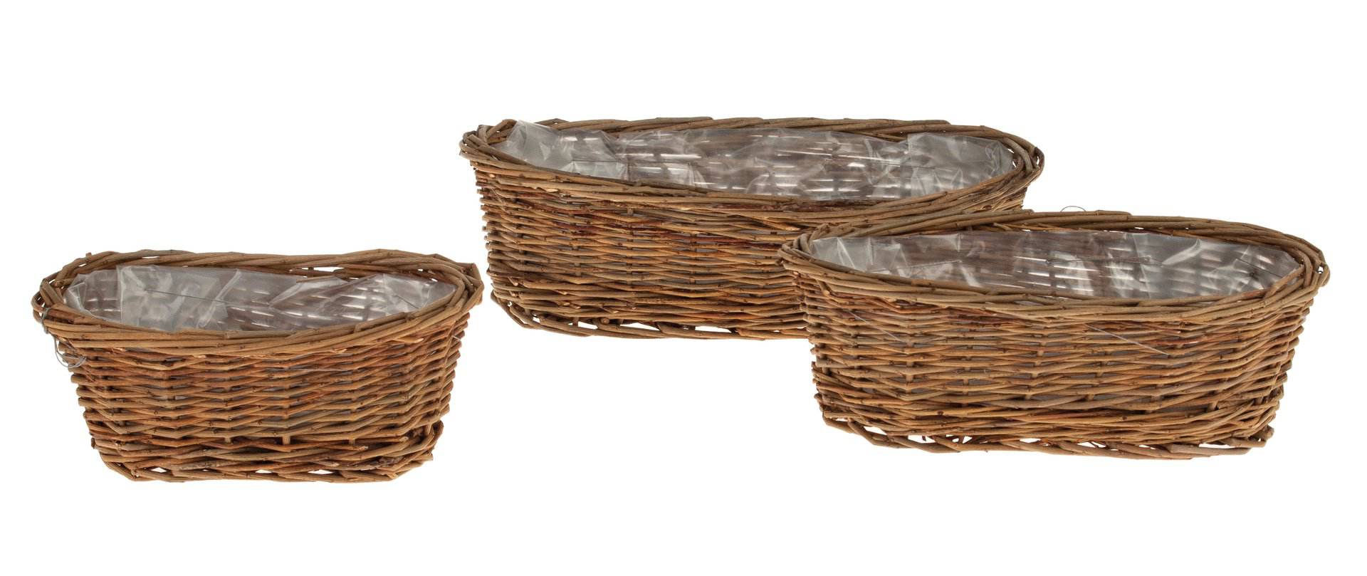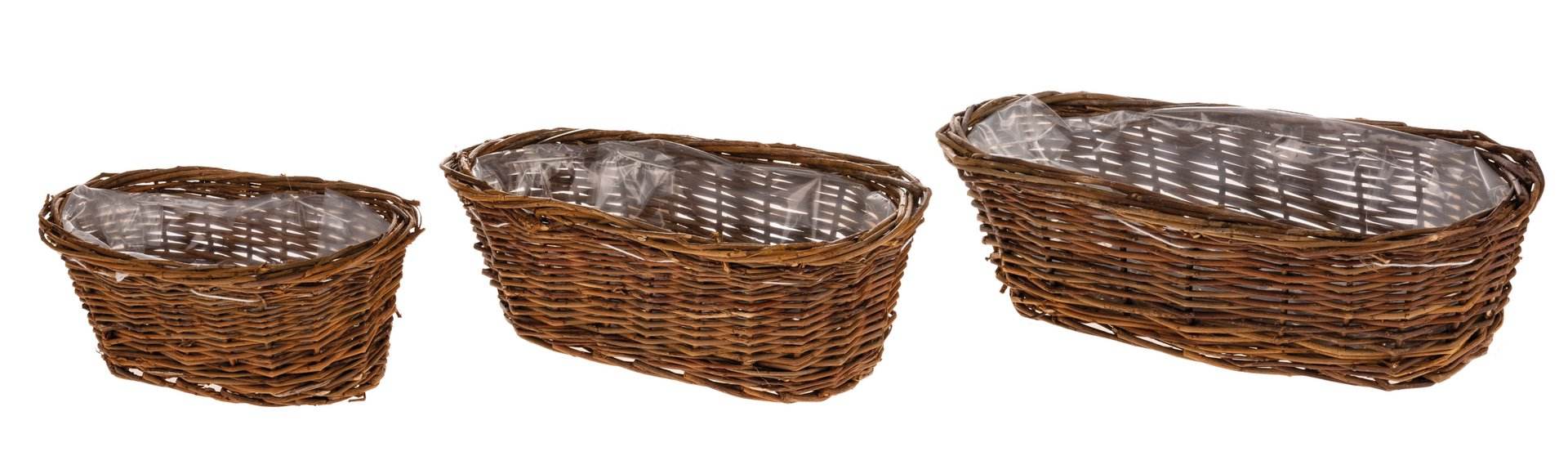 Cestino ovale per piante realizzato con strisce di truciolato di legno. Rivestito all'interno.Set da 3. Misure: 22 x 14 x 10 cm, 26 x 18 x 11 cm, 30 x 21 x 12 cm.