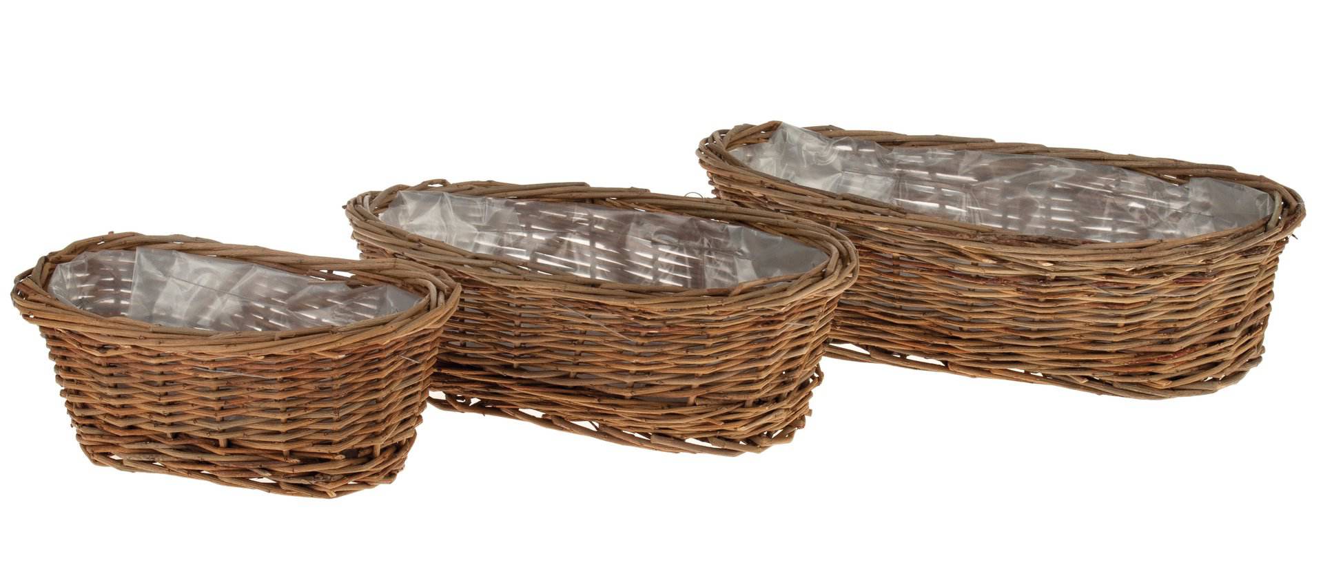 Cesti di vimini per piante. Rivestito all´interno. Set da 3. Misure: Ø 15 x 8 cm, Ø 22 x 10 cm e Ø 25 x 12 cm.
