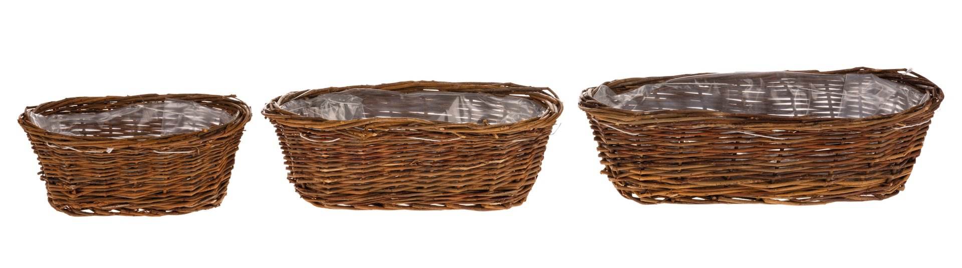 Navette di salice grigio spaccato bianco calcinato. Rivestito all´interno. Set da 3. Misure: 44 x 15 x 11 cm, 53 x 21 x 13 cm, 61 x 24 x 14 cm.