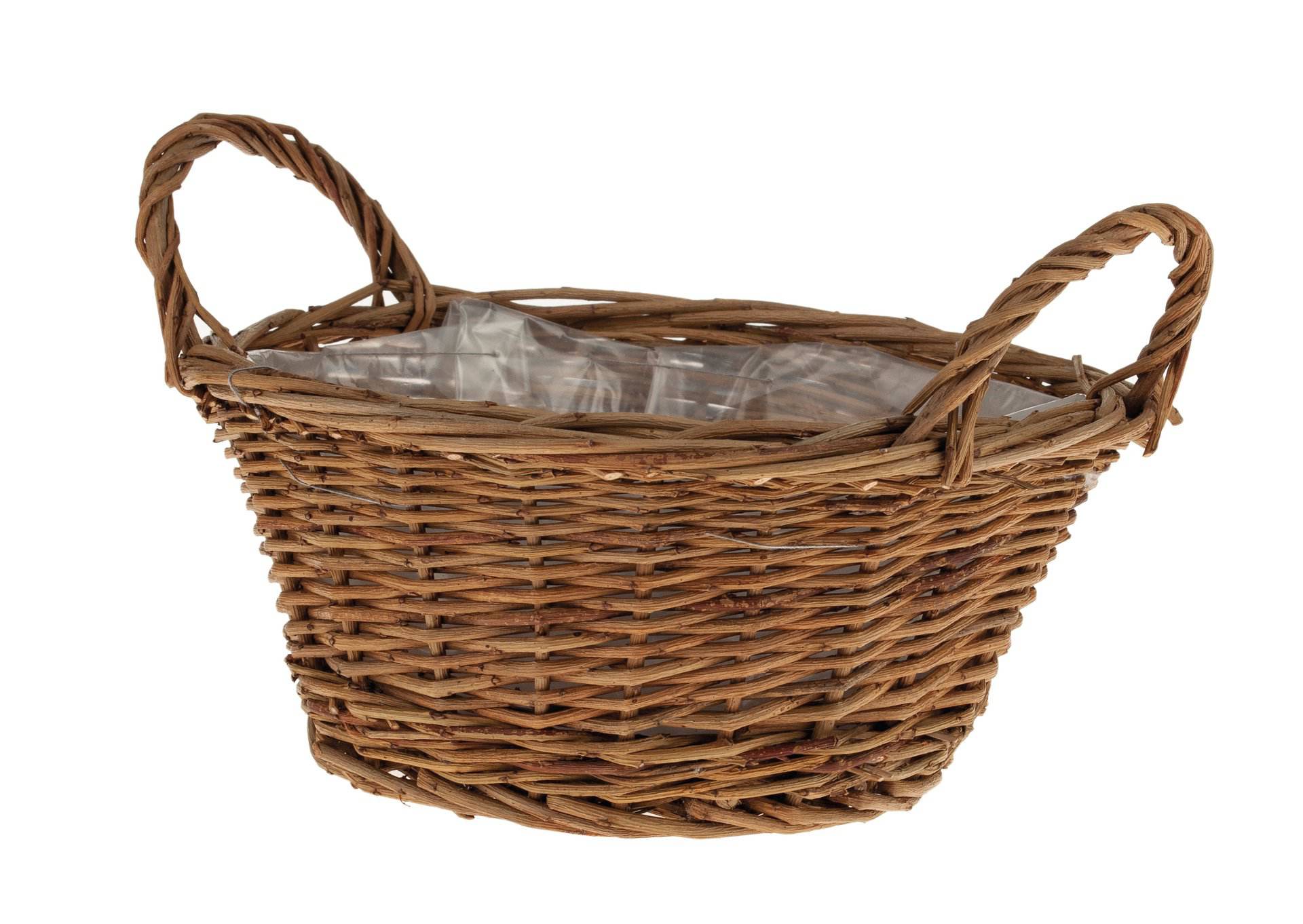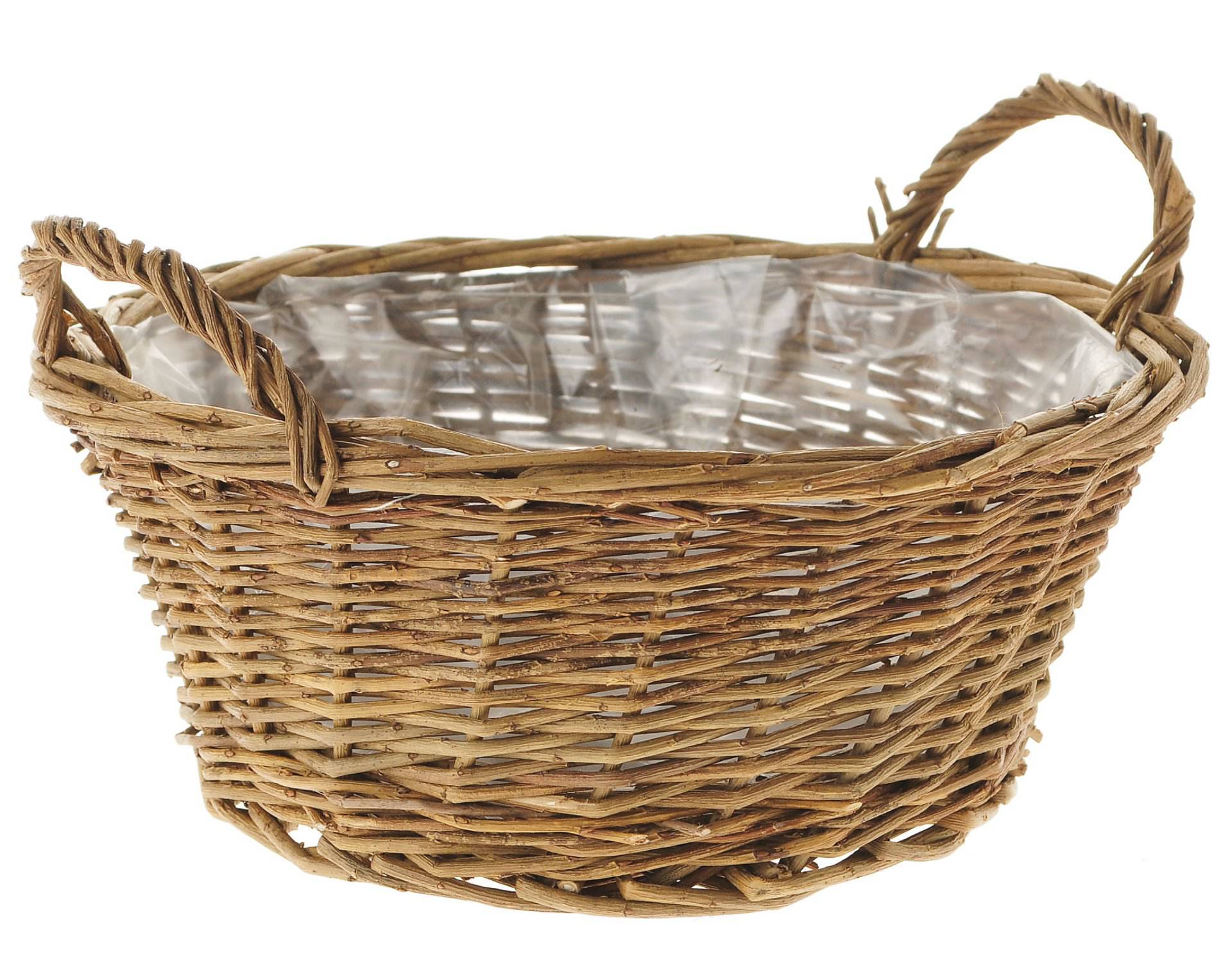 Cesto ovale di salice grigio spaccato in bianco calcinato con due manici. Rivestito all´interno.