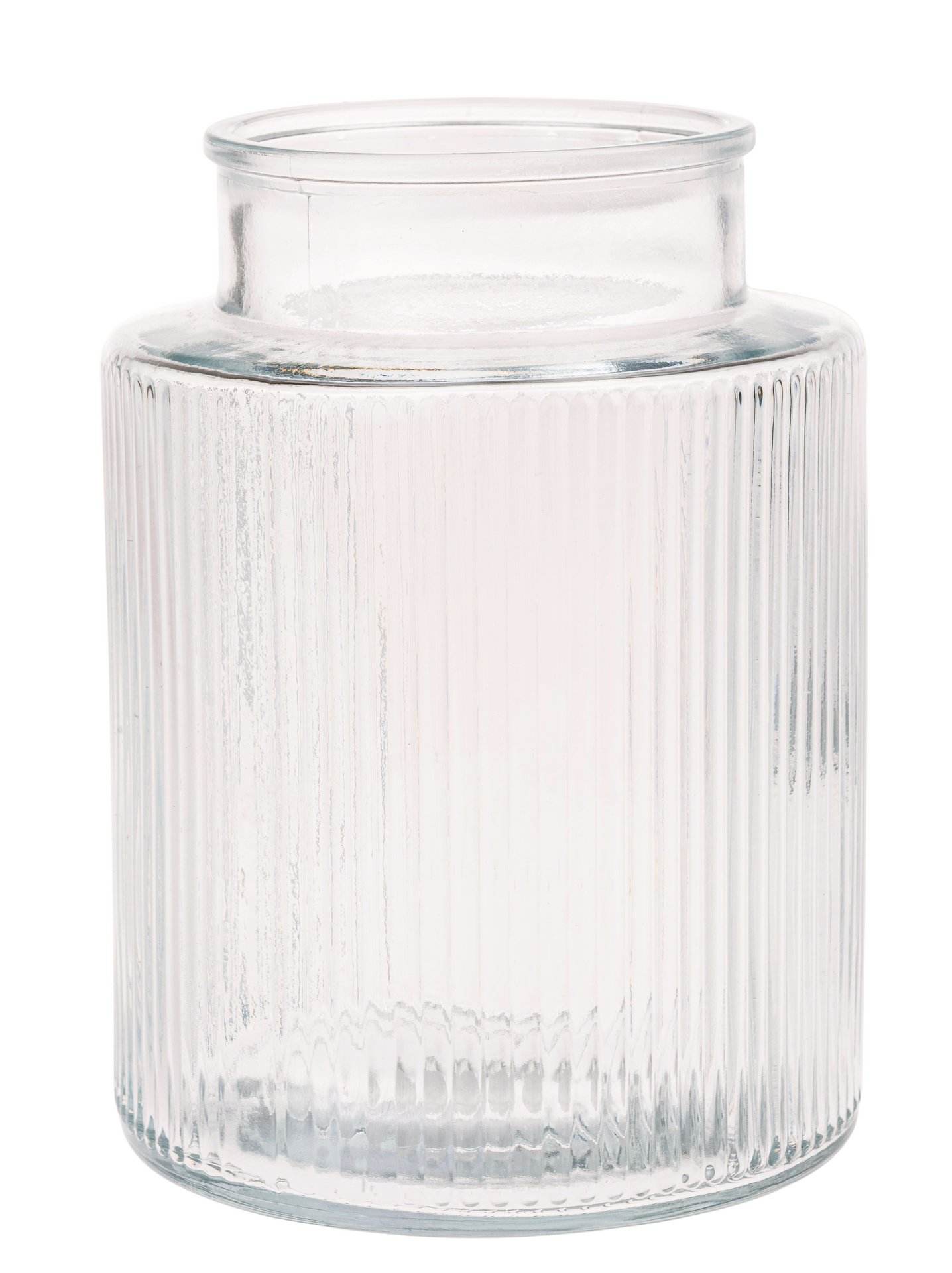 Vaso rotondo in vetro con struttura scanalata. Misure delle aperture: Ø 8 cm e Ø 9,5 cm.
