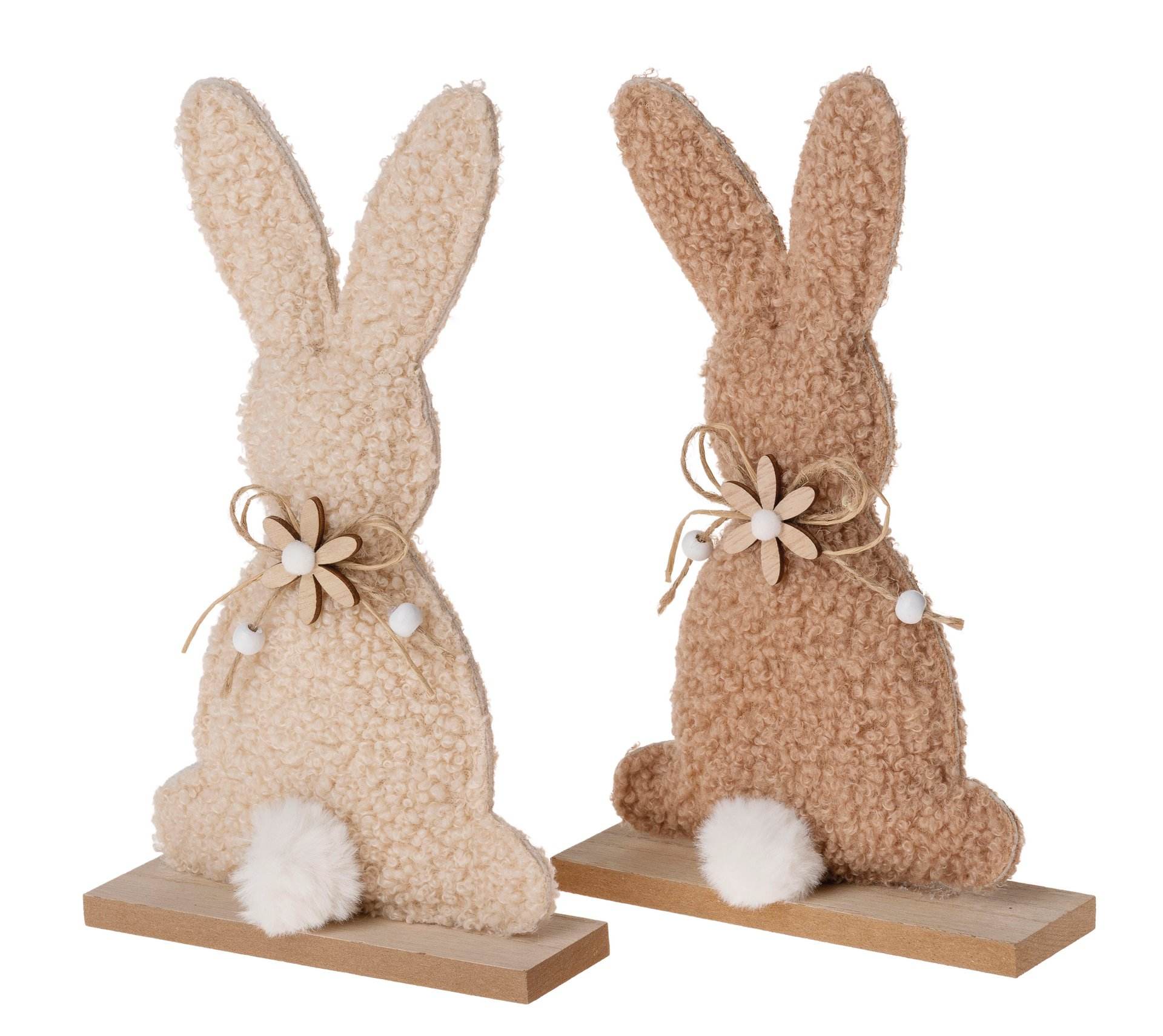 Figura di coniglio in poliestere su base in legno con fiocco e fiore in legno. 2 pezzi assortiti.