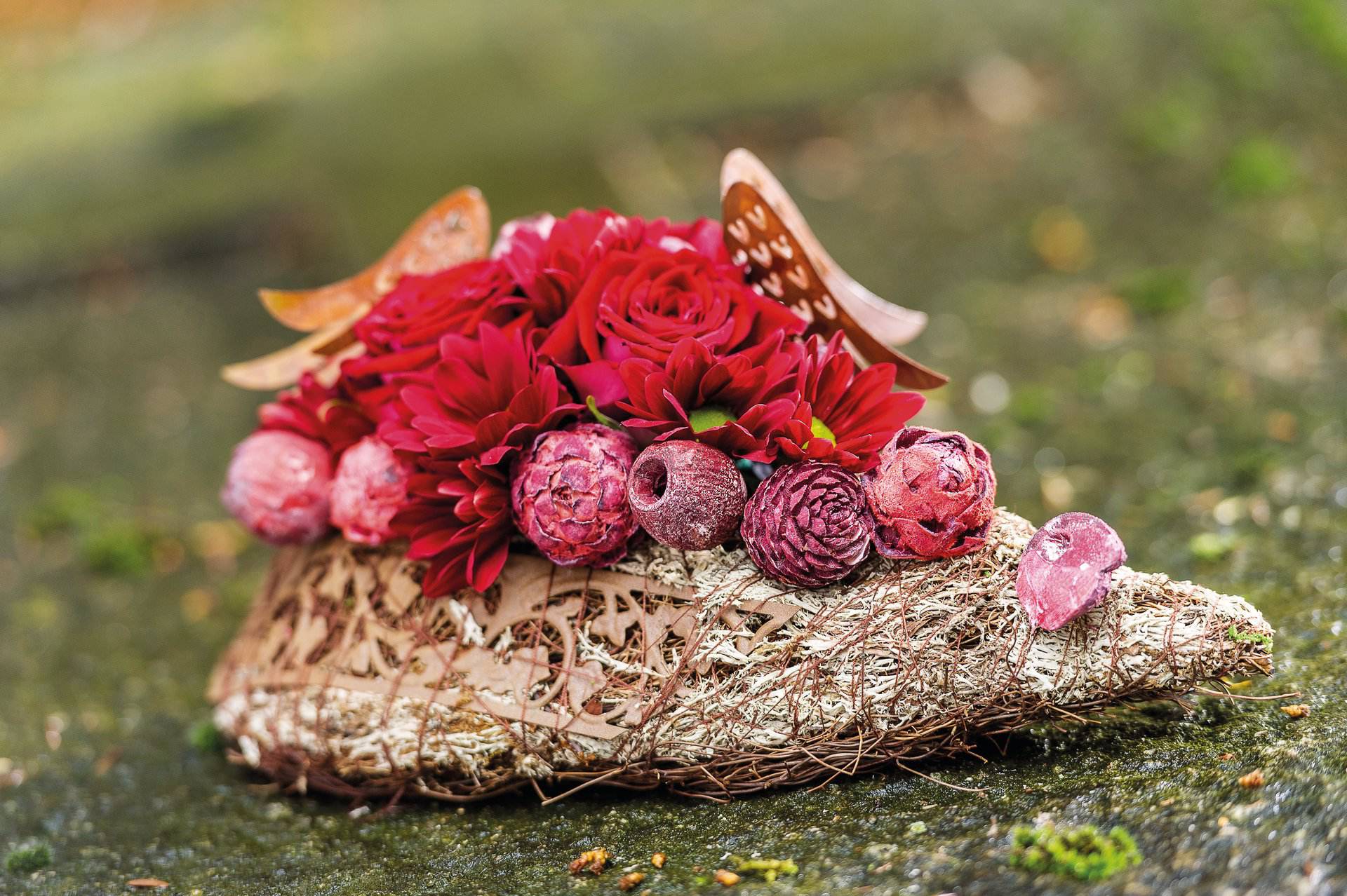 Testine di Leucodendron su astina di metallo in scatola di cartone. Misure: ca. Ø 3-4 cm, astina ca. 9 cm.