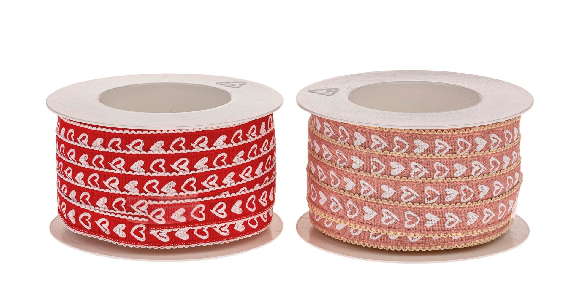 Nastro decorativo in cotone con cuori e bordo arricciato.