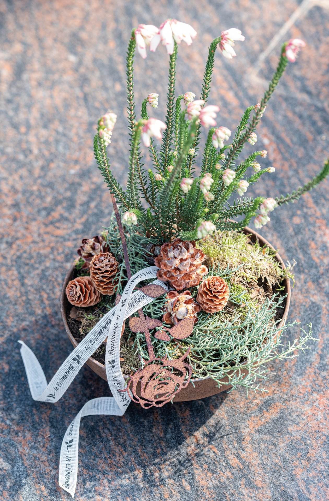 Nastro decorativo con scritta “In Erinnerung” (In ricordo) e bordo intrecciato.