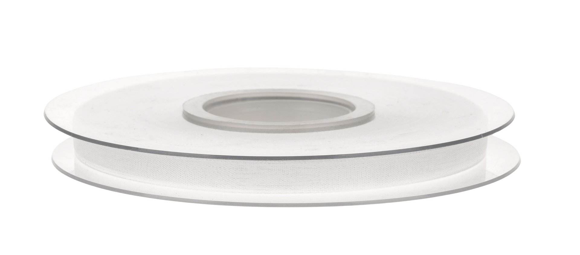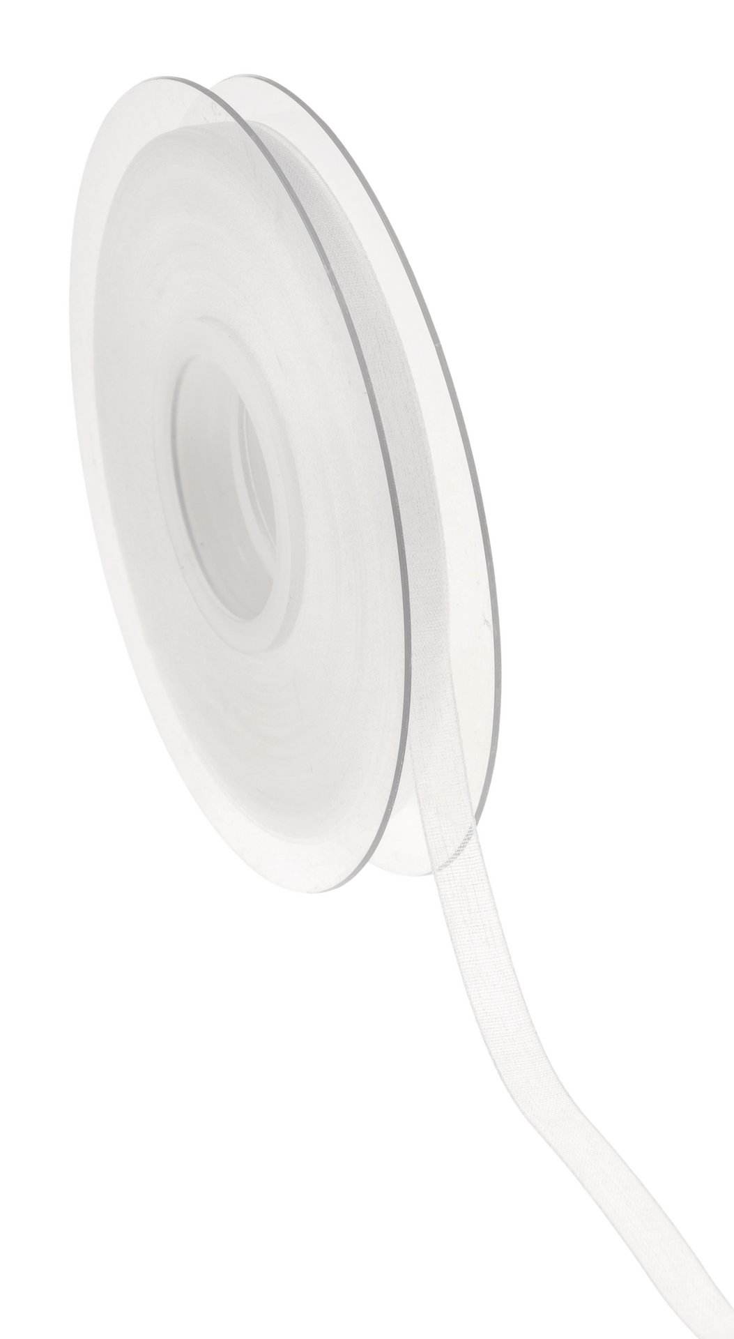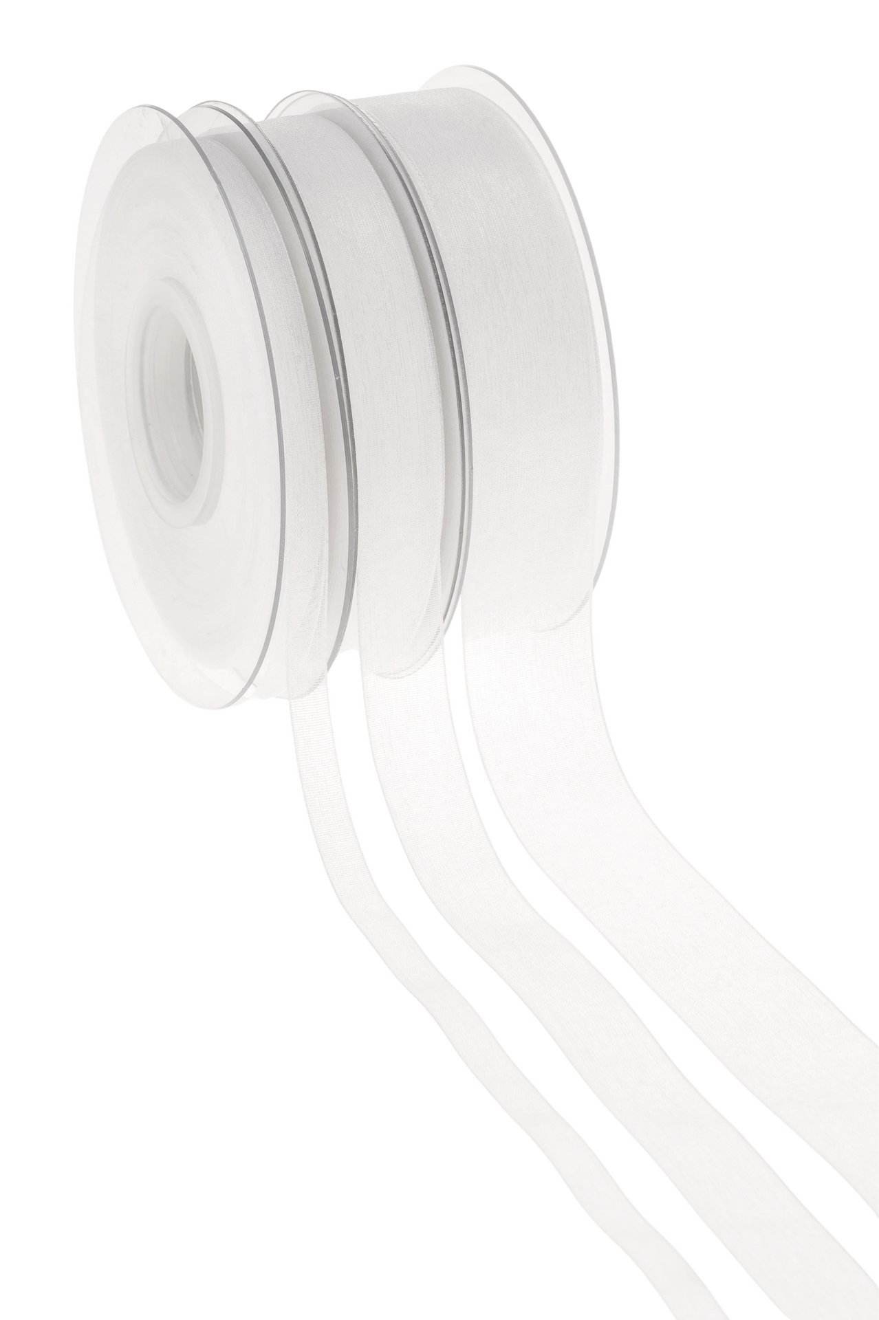 Delicato nastro di organza con bordo intrecciato. Misure: 6 mm x 50 m, 15 mm x 50 m e 25 mm x 50 m.