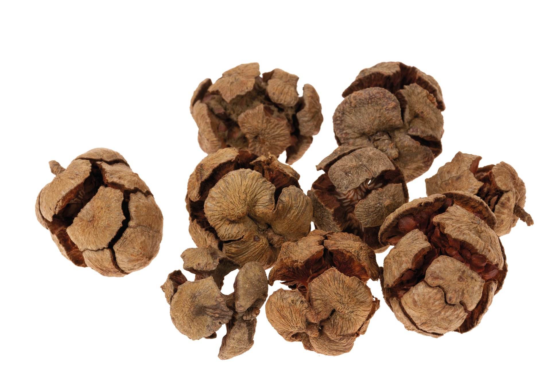 Scatola con pigne di cipresso maturi. Misure: Ø 2 - 3 cm.