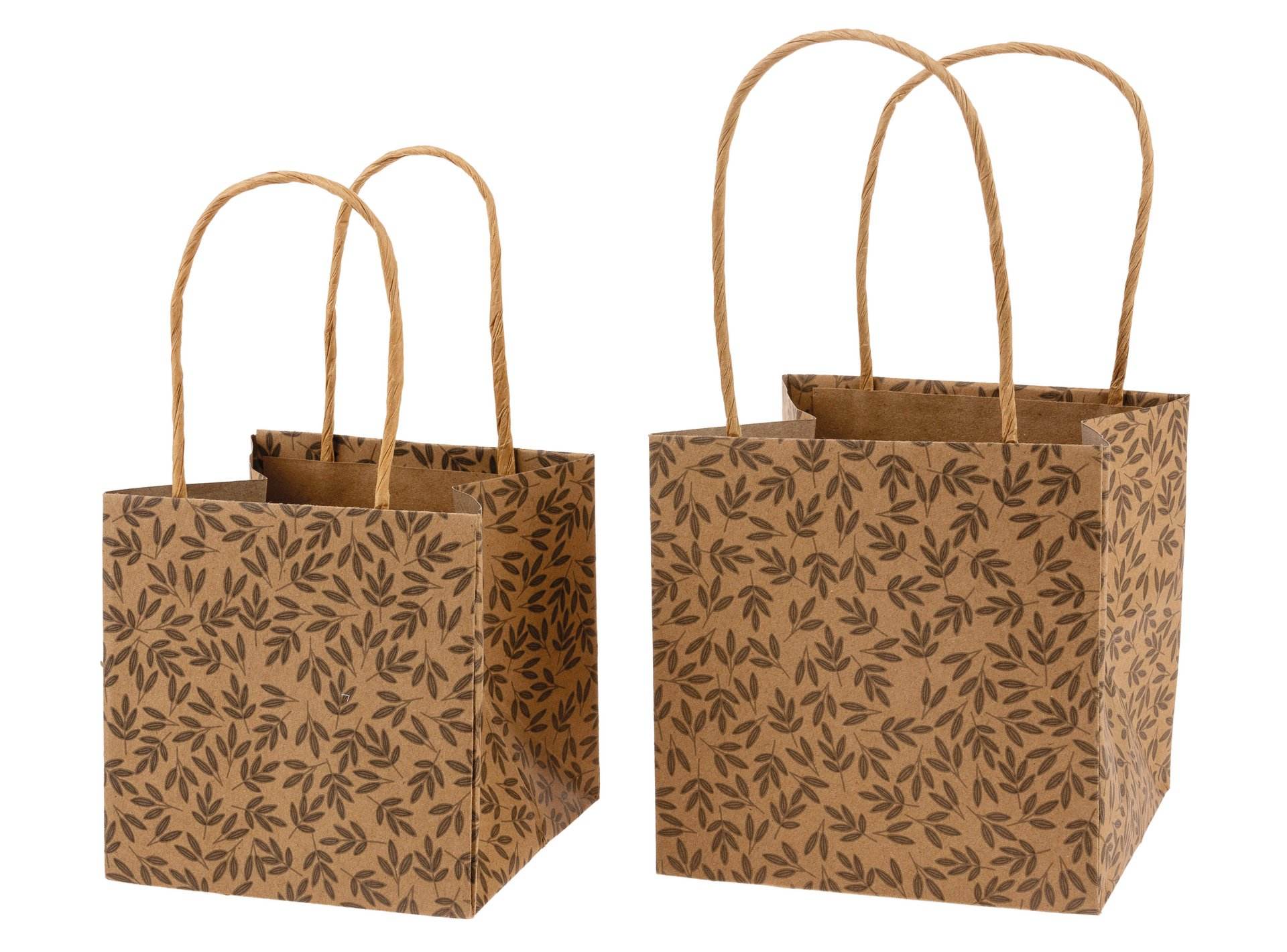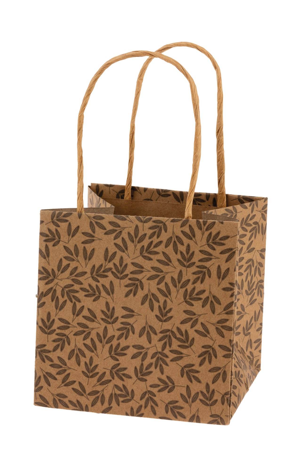 Sacchetto in carta kraft con manici e motivo a foglie. Rivestito all´interno.