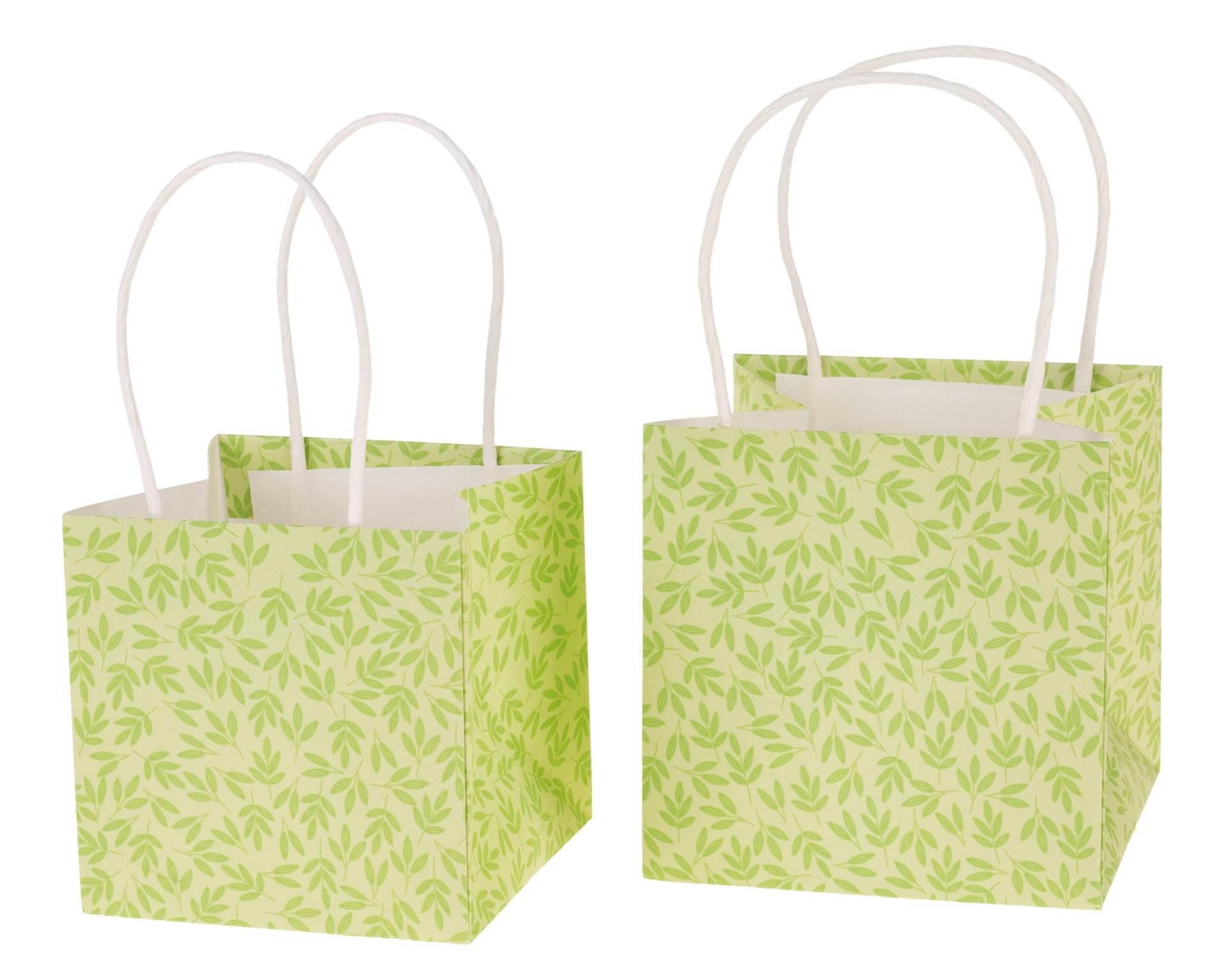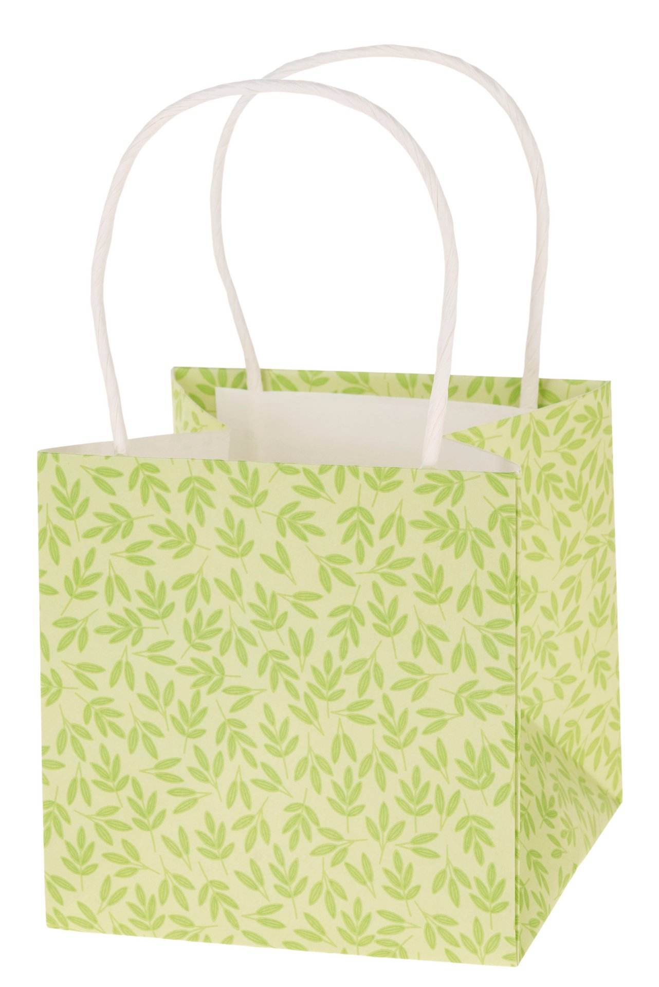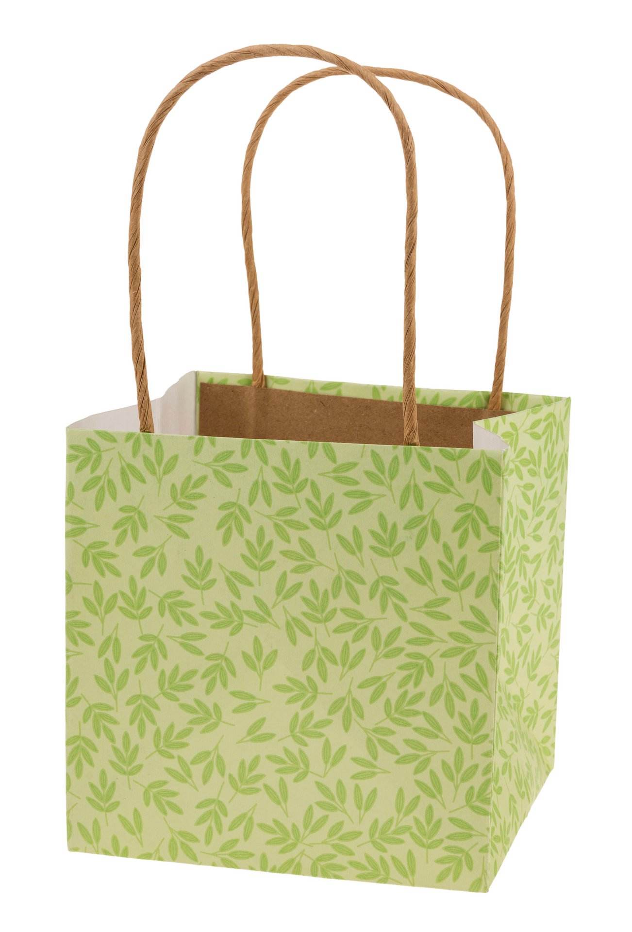 Sacchetto in carta kraft con manici e motivo a foglie. Rivestito all´interno.