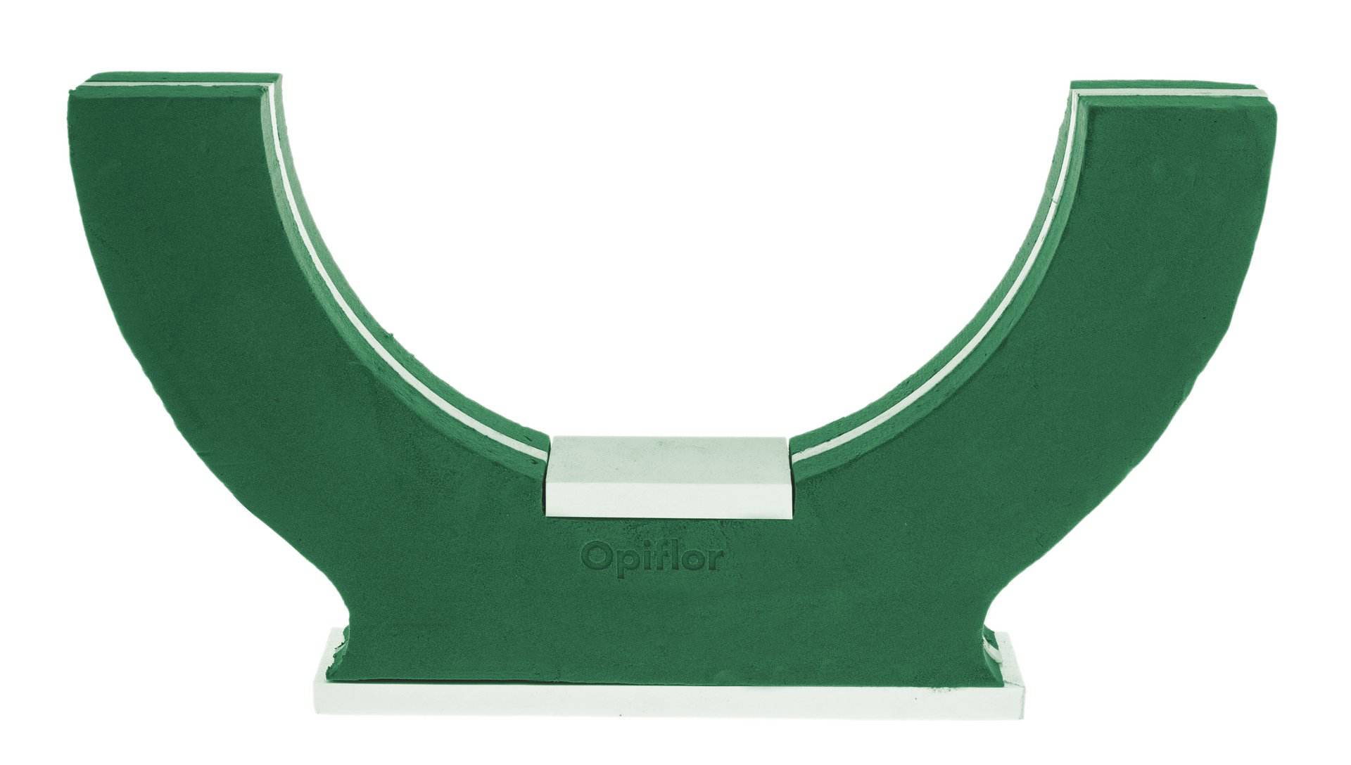 Semi-anello per urna in spugna idrofila con parte centrale in styrodur per diverse varianti di allestimento floreale. Durante l'immersione, assicurarsi che l'anello assorba l'acqua in modo autonomo. Poi girare l'anello per bagnare il lato opposto. Misure apertura per urna: 13 x 10 cm.