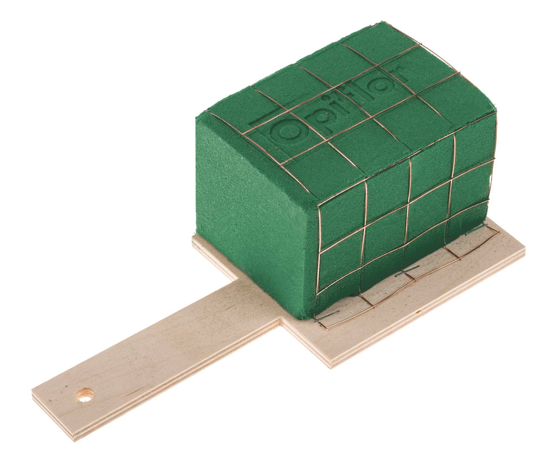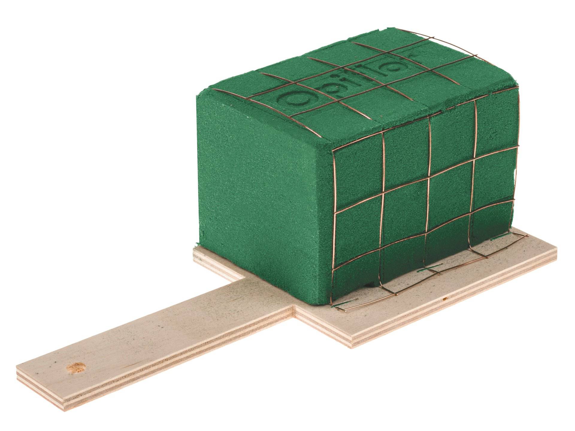 Trequarti di spugna idrofila Opiflor con rete metallica su base di legno. Con comoda impugnatura lunga 11 cm con un foro per un facile fissaggio.