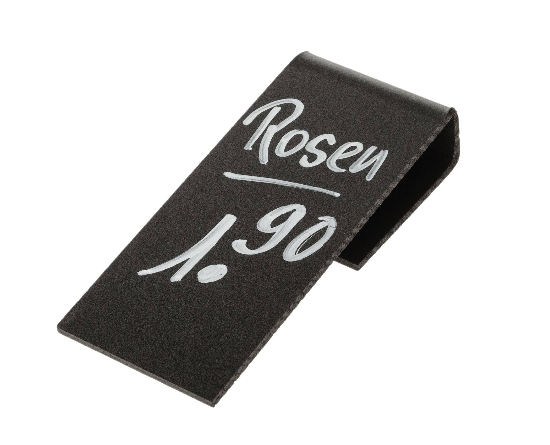 Targhetta in plastica da appendere al bordo dei vasi o altri oggetti con una profondità massima di 1,8 cm. Spessore del materiale 3 mm. Si può scrivere con gessetti o penne a gesso.