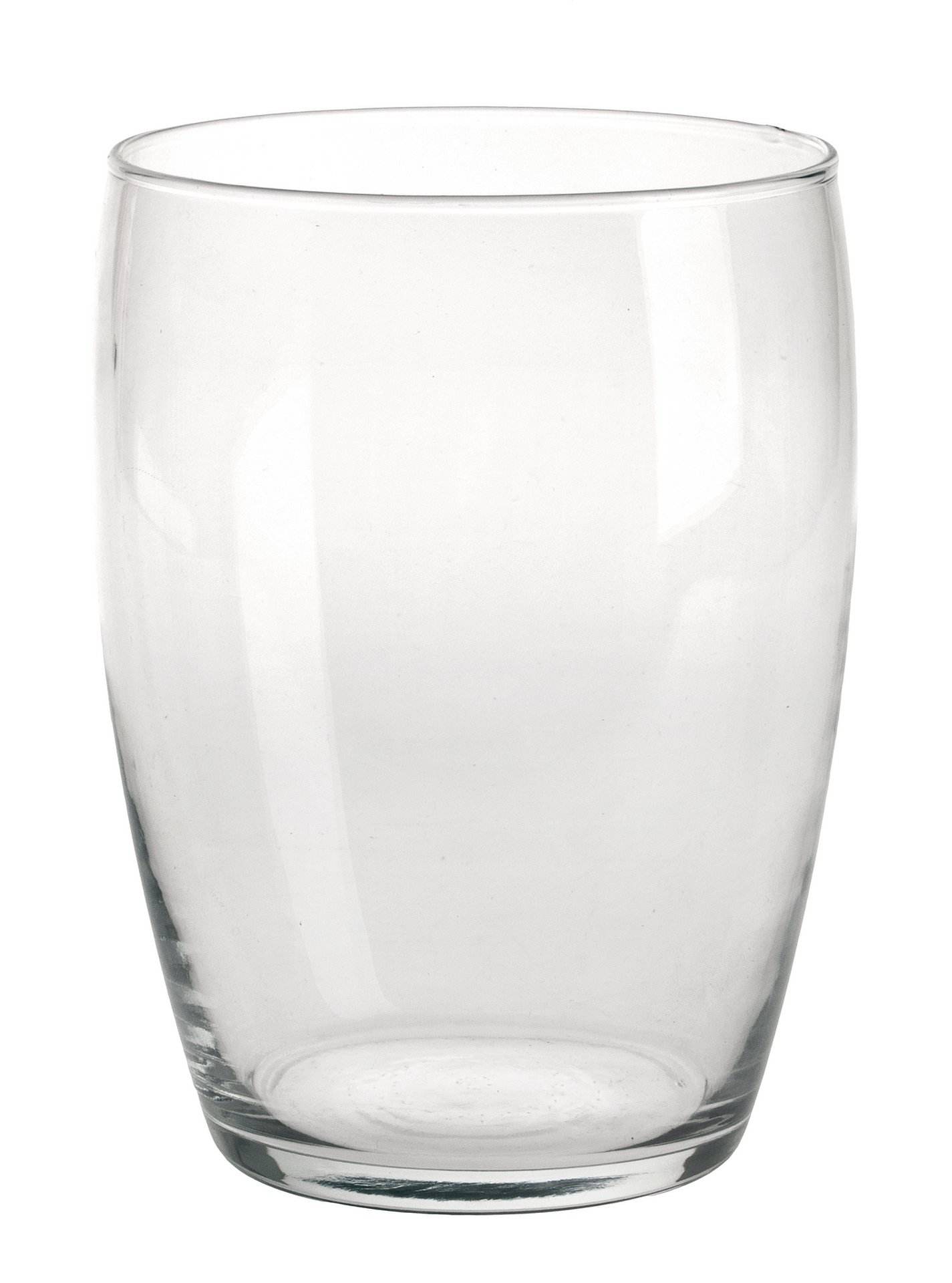 Vaso bombato di vetro. Fondo: Ø 10 cm, apertura: Ø 13 cm.