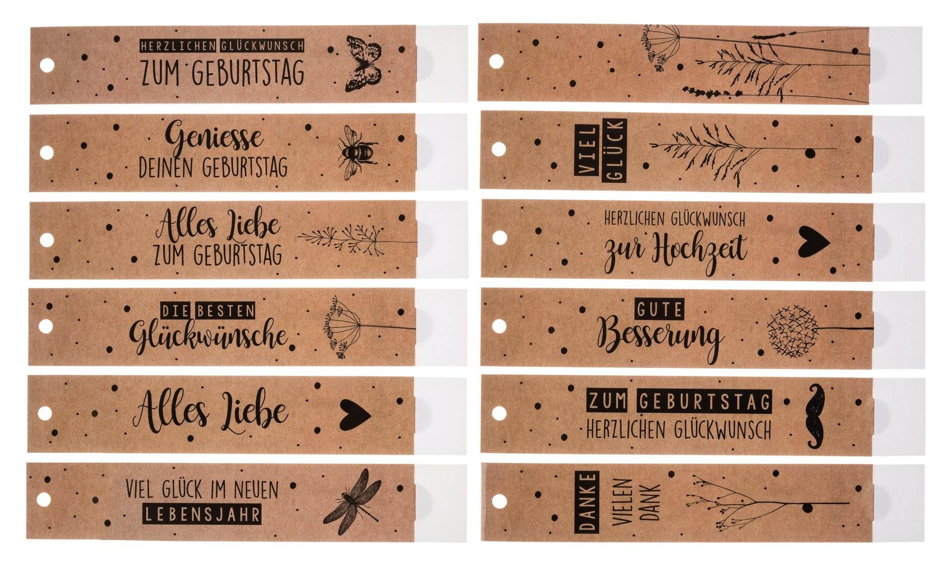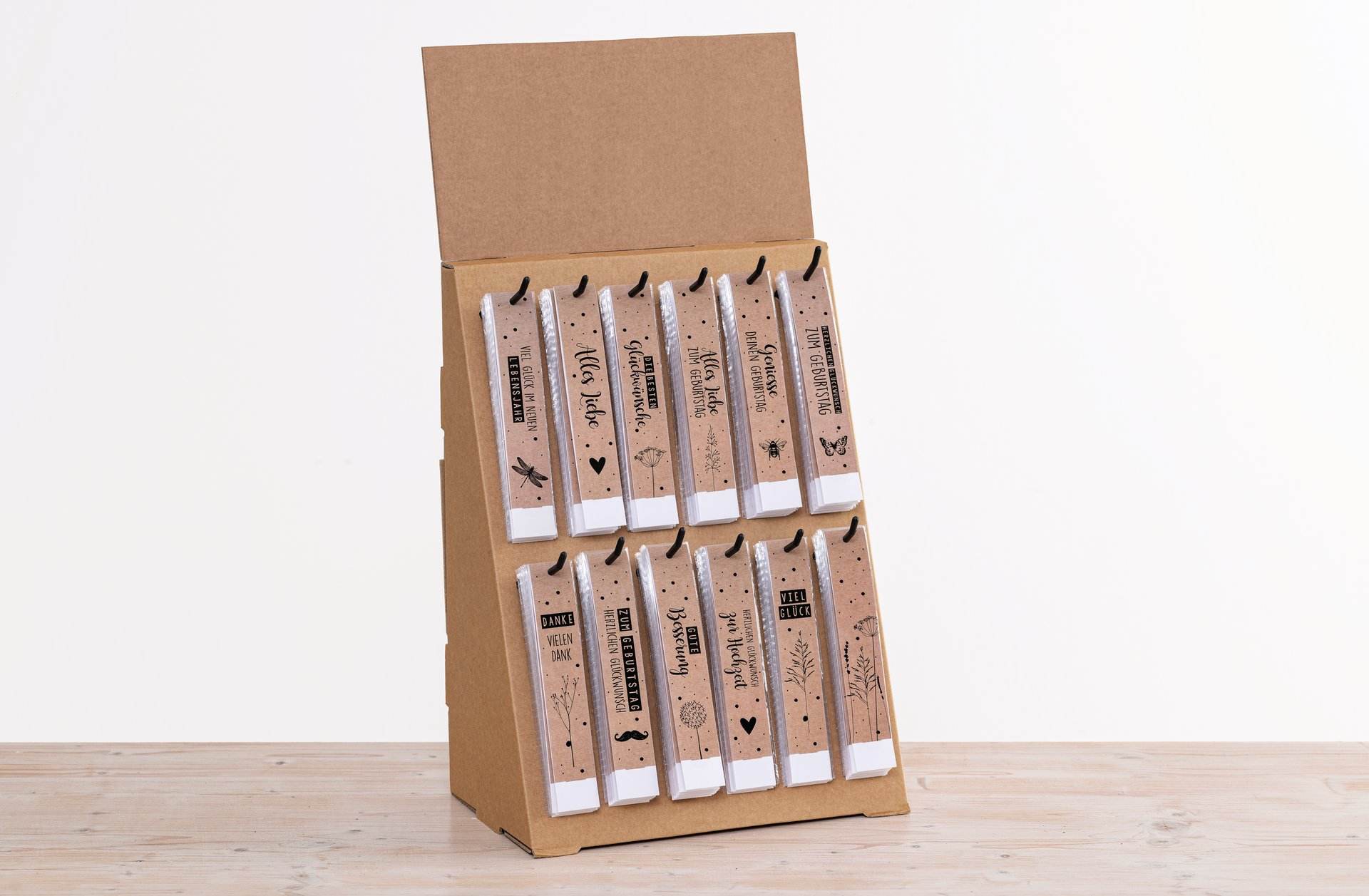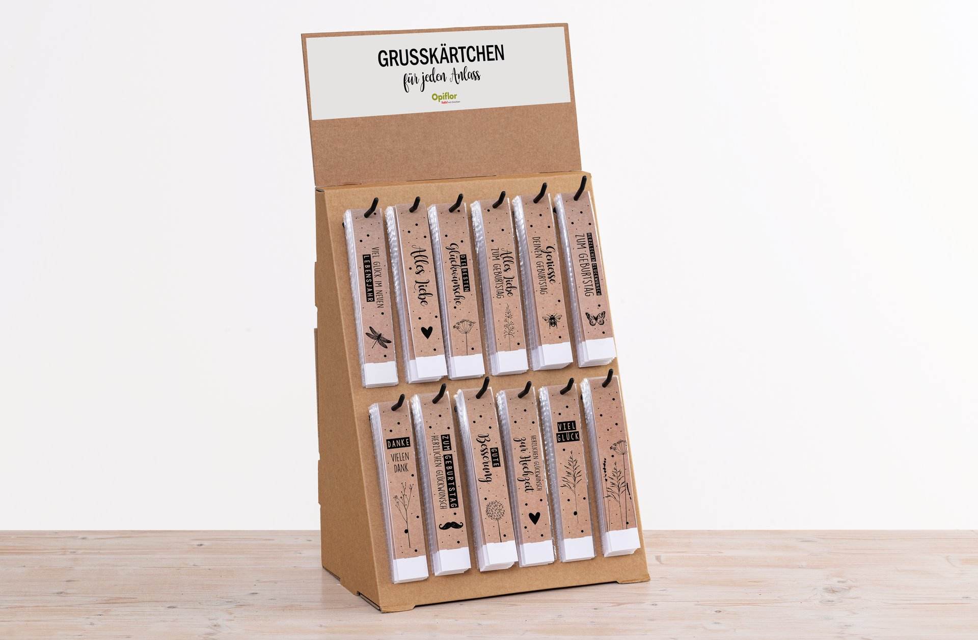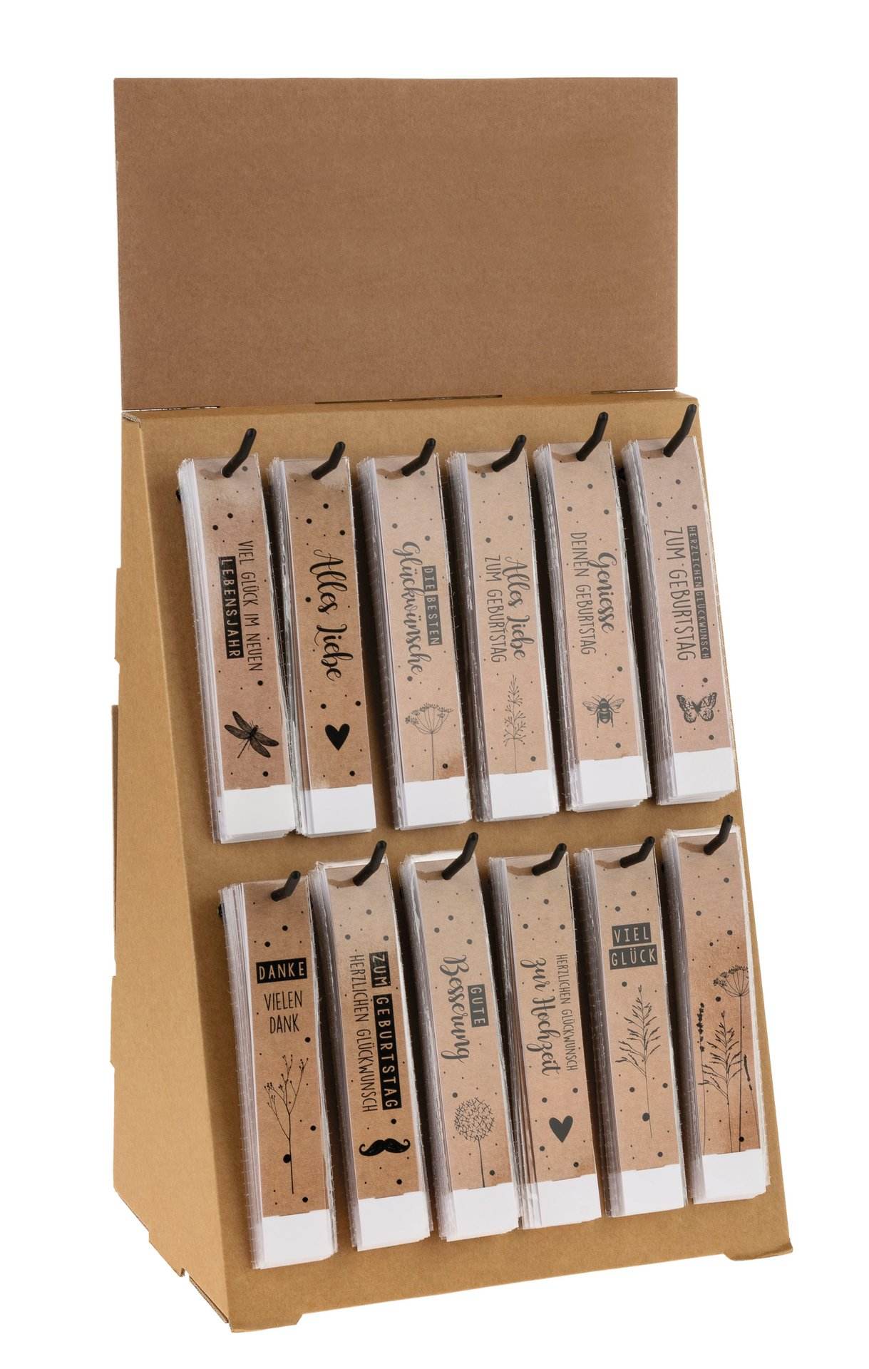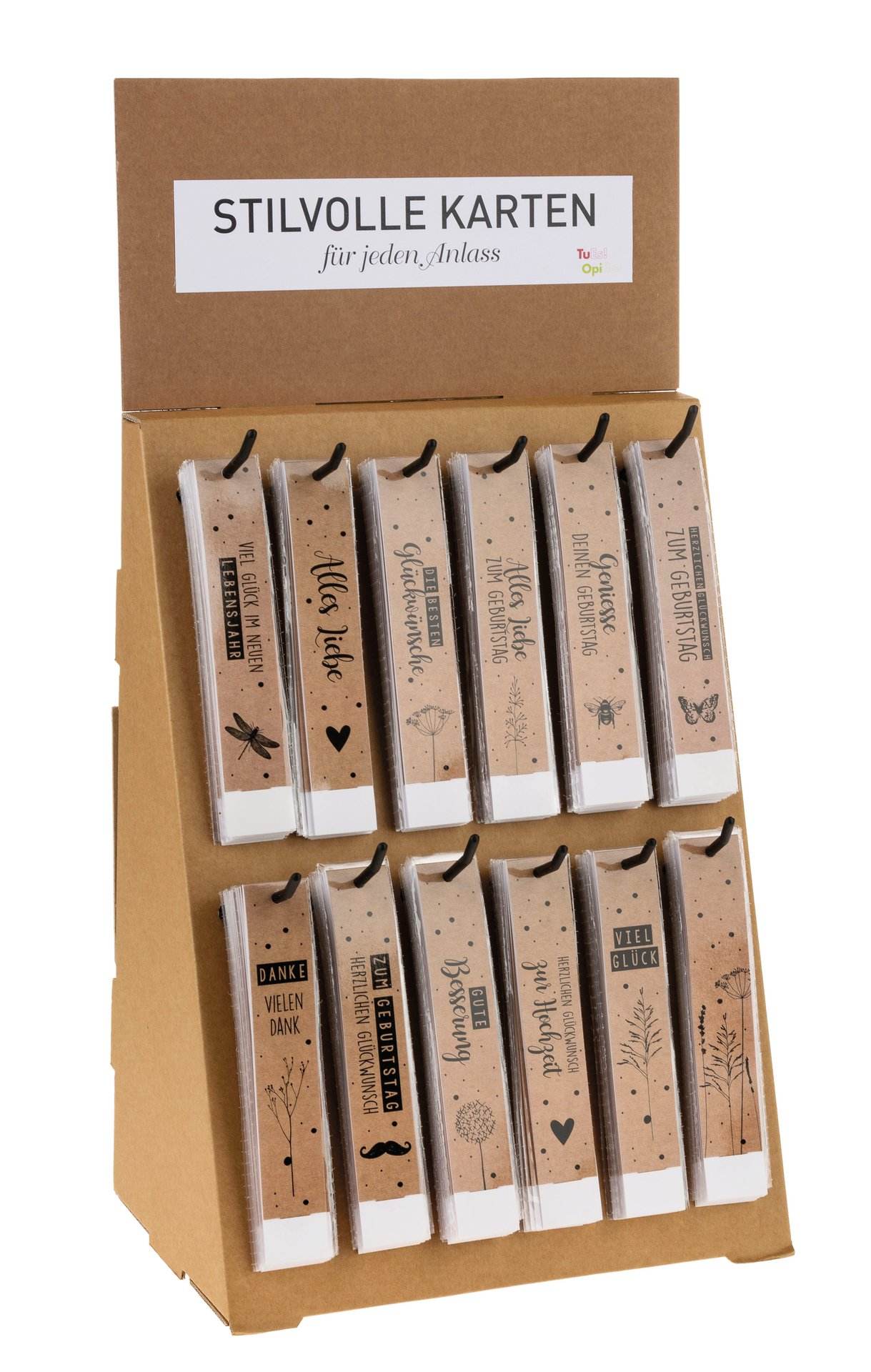 Espositore con carte pieghevoli in confezione di cellophane. L'interno dei cartoncini è vuoto. Il display può essere utilizzato anche senza testata. Contenuto: 1 espositore con 240 carte - 12 assortite (12 x 20 carte).